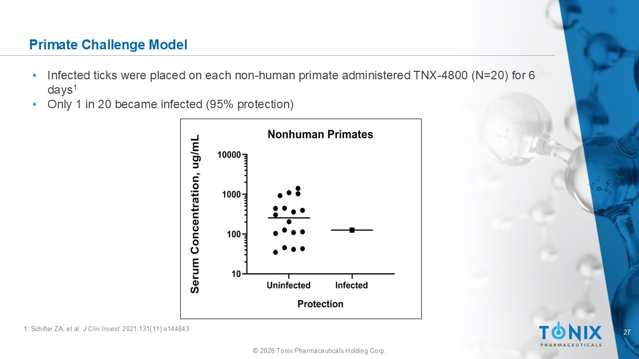 26 © 2026 Tonix Pharmaceuticals Holding Corp. Nonhuman Primate Challenge Model: Protocol and Protection by Dosage Level Day - 7 0 6 14 21 28 45 63 Serum Collection 1 Jacket Acclimation Tick Challenge Tissue Biopsy Culture Observations HuMAb Injection Study Design 1 : Results: • 4 dosing cohorts, 1 irrelevant IgG control • 4 to 6 animals per cohort • Seroconversion for IgG antibodies against B. burgdorferi was measured as an indicator of efficacy Irrelevant IgG Cohort 4 Cohort 3 Cohort 2 Cohort 1 Cohort 10 90 30 10 3 Dose (mg/kg) 0 100 100 83 100 Protection (%) N/A <0.001 <0.001 <0.001 <0.001 P value 1. Schiller ZA, et al. J Clin Invest . 2021;131(11):e1144843. HuMAb =human monoclonal antibody; IgG=immunoglobulin G.