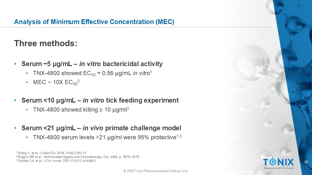 28 © 2026 Tonix Pharmaceuticals Holding Corp. Analysis of Minimum Effective Concentration (MEC) 1 Wang Y, et al. J Infect Dis. 2016. 214(2):205 - 11. 2 Rogers RR et al , Antimicrobial Agents and Chemotherapy, Oct. 2004, p. 3670 – 3676 3 Schiller ZA, et al. J Clin Invest . 2021;131(11):e144843. Three methods: • Serum ~ 5 μ g/mL – in vitro bactericidal activity • TNX - 4800 showed EC 50 ≈ 0.56 μ g/mL in vitro 1 • MEC ~ 10X EC 50 2 • Serum <10 μ g/mL – in vitro tick feeding experiment • TNX - 4800 showed killing ≥ 10 μ g/ml 3 • Serum <21 μ g/mL – in vivo primate challenge model • TNX - 4800 serum levels >21 μ g/ml were 95% protective 1,3