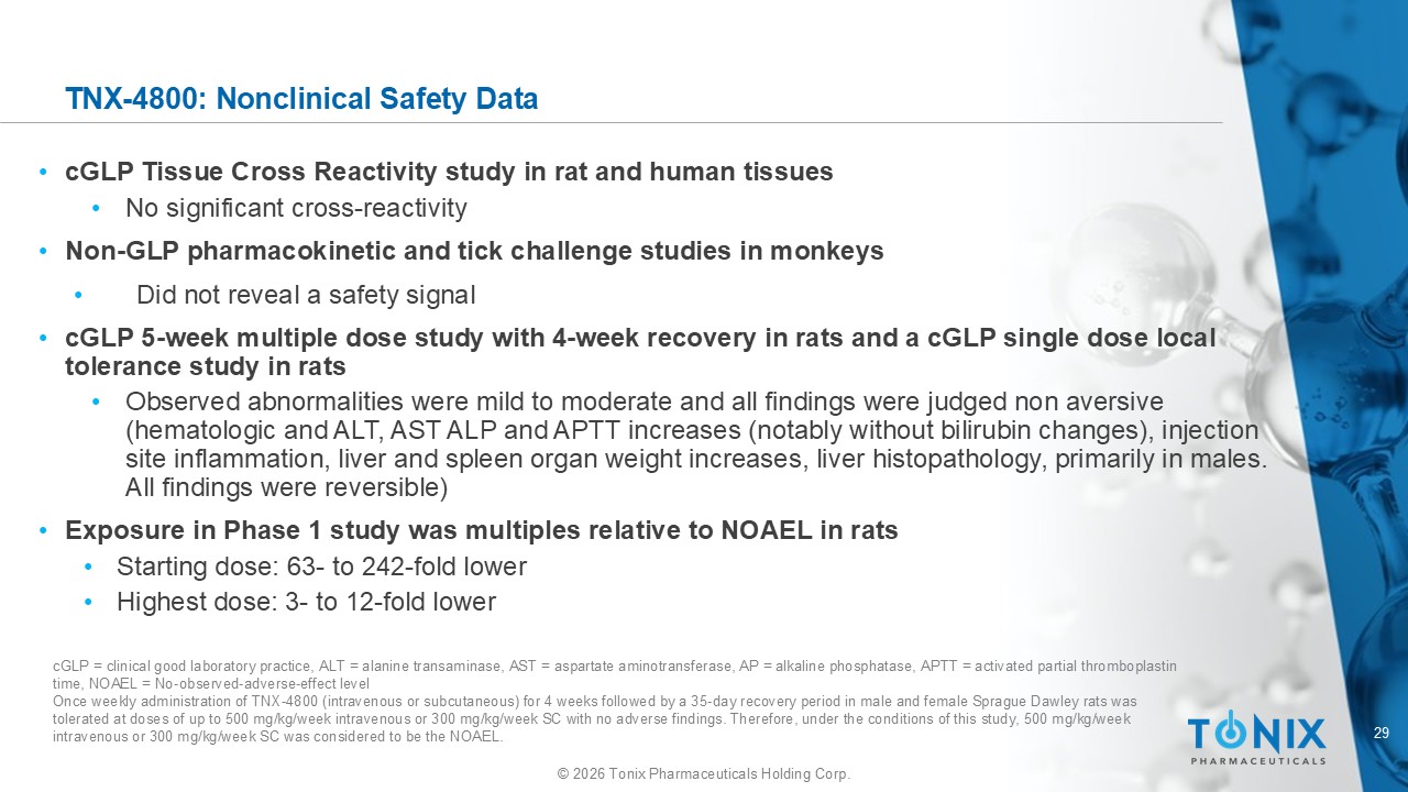 29 © 2026 Tonix Pharmaceuticals Holding Corp. TNX - 4800: Nonclinical Safety Data • cGLP Tissue Cross Reactivity study in rat and human tissues • No significant cross - reactivity • Non - GLP pharmacokinetic and tick challenge studies in monkeys • Did not reveal a safety signal • cGLP 5 - week multiple dose study with 4 - week recovery in rats and a cGLP single dose local tolerance study in rats • Observed abnormalities were mild to moderate and all findings were judged non aversive (hematologic and ALT, AST ALP and APTT increases (notably without bilirubin changes), injection site inflammation, liver and spleen organ weight increases, liver histopathology, primarily in males. All findings were reversible) • Exposure in Phase 1 study was multiples relative to NOAEL in rats • Starting dose: 63 - to 242 - fold lower • Highest dose: 3 - to 12 - fold lower cGLP = clinical good laboratory practice, ALT = alanine transaminase, AST = aspartate aminotransferase, AP = alkaline phosphatase, A PTT = activated partial thromboplastin time, NOAEL = No - observed - adverse - effect level Once weekly administration of TNX - 4800 (intravenous or subcutaneous) for 4 weeks followed by a 35 - day recovery period in male an d female Sprague Dawley rats was tolerated at doses of up to 500 mg/kg/week intravenous or 300 mg/kg/week SC with no adverse findings. Therefore, under the co ndi tions of this study, 500 mg/kg/week intravenous or 300 mg/kg/week SC was considered to be the NOAEL.