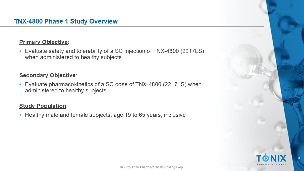 30 © 2026 Tonix Pharmaceuticals Holding Corp. TNX - 4800 Phase 1 Study Overview Primary Objective : • Evaluate safety and tolerability of a SC injection of TNX - 4800 (2217LS) when administered to healthy subjects Secondary Objective : • Evaluate pharmacokinetics of a SC dose of TNX - 4800 (2217LS) when administered to healthy subjects Study Population : • Healthy male and female subjects, age 19 to 65 years, inclusive
