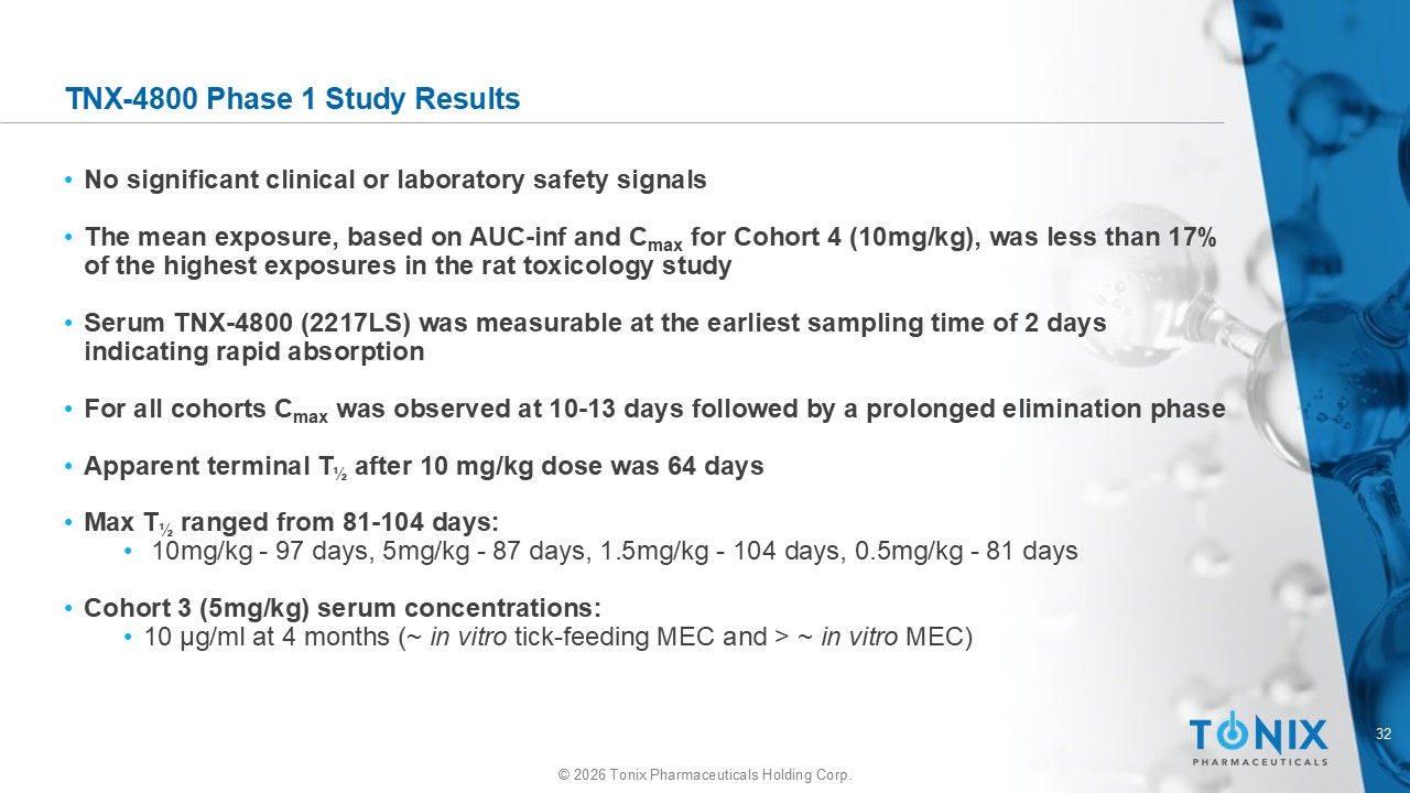 31 © 2026 Tonix Pharmaceuticals Holding Corp. Human Phase 1 Study: Safety, Tolerability and Immunogenicity: Design Sullivan - Bólyai JZ, et al. Manuscript in progress. 2025. • First - in - human, randomized, double - blind, sequential dose - escalation study (N=44) • Healthy male and female subjects aged 19 to 65 years, serum negative for anti – B. burgdorferi antibodies, by an FDA - approved modified 2 - tier ELISA test, were recruited • Safety was assessed via clinical and lab evaluations • Serum TNX - 4800 concentrations were measured by ELISA, with pharmacokinetic analysis • Antidrug antibodies were detected using an electrochemiluminescence immunoassay 1.5 mg/kg 2217LS (N=8) Completed (N=41) Enrolled (N=44) 0.5 mg/kg 2217LS (N=10) 5.0 mg/kg 2217LS (N=8) Cohort 1 Cohort 2 Cohort 3 10 mg/kg 2217LS (N=8) Placebo (N=10) Cohort 4