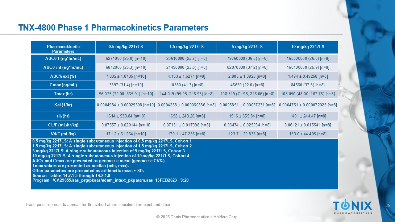 34 © 2026 Tonix Pharmaceuticals Holding Corp. TNX - 4800 Phase 1: Variability of Serum Concentrations at Sampling Time Points Among Subjects in Each Dosing Cohort Each point represents a mean for the cohort at the specified timepoint and dose The profiles for 1.5 mg/kg, 5 mg/kg and 10 mg/kg TNX - 4800 (2217LS) are shifted to the right for ease of reaching
