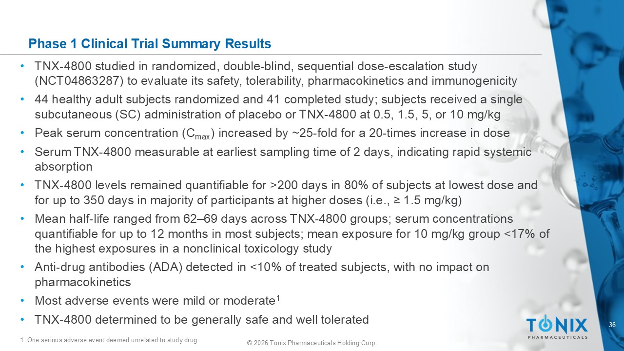 35 © 2026 Tonix Pharmaceuticals Holding Corp. TNX - 4800 Phase 1 Pharmacokinetics Parameters Each point represents a mean for the cohort at the specified timepoint and dose 10 mg/kg 2217LS 5 mg/kg 2217LS 1.5 mg/kg 2217LS 0.5 mg/kg 2217LS Pharmacokinetic Parameters 165500000 (26.0) [n=8] 79760000 (36.5) [n=8] 20610000 (23.7) [n=8] 6271000 (26.0) [n=10] AUC0 - t (ng* hr /mL) 168100000 (25.9) [n=8] 82070000 (37.2) [n=8] 21490000 (23.5) [n=8] 6812000 (25.3) [n=10] AUC0 - inf (ng* hr /mL) 1.494 ± 0.49258 [n=8] 2.805 ± 1.3920 [n=8] 4.103 ± 1.6271 [n=8] 7.832 ± 4.8735 [n=10] AUC%ext (%) 84560 (37.5) [n=8] 45650 (22.0) [n=8] 10880 (41.3) [n=8] 3397 (31.4) [n=10] Cmax (ng/mL) 108.050 (48.00, 167.78) [n=8] 108.319 (71.98, 216.06) [n=8] 144.019 (95.95, 215.95) [n=8] 96.075 (72.00, 335.91) [n=10] Tmax ( hr ) 0.0004751 ± 0.000072023 [n=8] 0.0005851 ± 0.00037231 [n=8] 0.0004258 ± 0.000060386 [n=8] 0.0004984 ± 0.00025308 [n=10] Kel (1/hr) 1491 ± 244.47 [n=8] 1516 ± 655.84 [n=8] 1658 ± 243.26 [n=8] 1614 ± 533.84 [n=10] t½ ( hr ) 0.06121 ± 0.015541 [n=8] 0.06474 ± 0.025934 [n=8] 0.07151 ± 0.017398 [n=8] 0.07557 ± 0.020144 [n=10] CL/F (mL/ hr /kg) 133.0 ± 44.405 [n=8] 123.7 ± 29.838 [n=8] 170.1 ± 47.286 [n=8] 171.2 ± 61.264 [n=10] Vd /F (mL/kg) 0.5 mg/kg 2217LS: A single subcutaneous injection of 0.5 mg/kg 2217LS, Cohort 1 1.5 mg/kg 2217LS: A single subcutaneous injection of 1.5 mg/kg 2217LS, Cohort 2 5 mg/kg 2217LS: A single subcutaneous injection of 5 mg/kg 2217LS, Cohort 3 10 mg/kg 2217LS: A single subcutaneous injection of 10 mg/kg 2217LS, Cohort 4 AUCs and Cmax are presented as geometric mean (geometric CV%). Tmax values are presented as median (min, max). Other parameters are presented as arithmetic mean ± SD. Source: Tables 14.2.1.5 through 14.2.1.8 Program: /CA29655/ sas_prg / pksas / adam_intext_pkparam.sas 13FEB2023 9:20