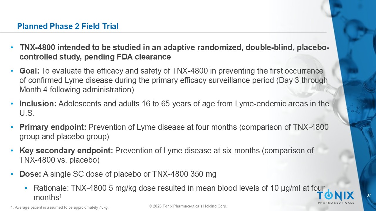 36 © 2026 Tonix Pharmaceuticals Holding Corp. Phase 1 Clinical Trial Summary Results • TNX - 4800 studied in randomized, double - blind, sequential dose - escalation study (NCT04863287) to evaluate its safety, tolerability, pharmacokinetics and immunogenicity • 44 healthy adult subjects randomized and 41 completed study; subjects received a single subcutaneous (SC) administration of placebo or TNX - 4800 at 0.5, 1.5, 5, or 10 mg/kg • Peak serum concentration ( C max ) increased by ~25 - fold for a 20 - times increase in dose • Serum TNX - 4800 measurable at earliest sampling time of 2 days, indicating rapid systemic absorption • TNX - 4800 levels remained quantifiable for >200 days in 80% of subjects at lowest dose and for up to 350 days in majority of participants at higher doses (i.e., ≥ 1.5 mg/kg) • Mean half - life ranged from 62 – 69 days across TNX - 4800 groups; serum concentrations quantifiable for up to 12 months in most subjects; mean exposure for 10 mg/kg group <17% of the highest exposures in a nonclinical toxicology study • Anti - drug antibodies (ADA) detected in <10% of treated subjects, with no impact on pharmacokinetics • Most adverse events were mild or moderate 1 • TNX - 4800 determined to be generally safe and well tolerated 1. One serious adverse event deemed unrelated to study drug .