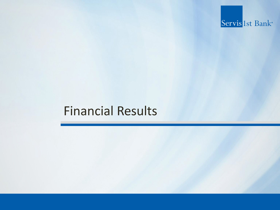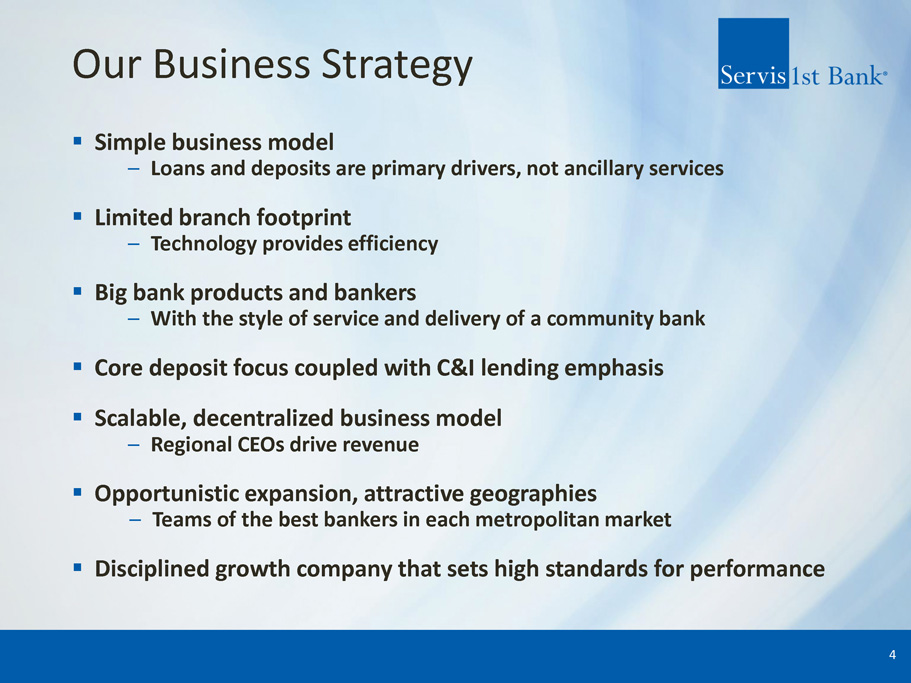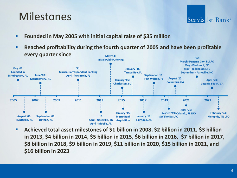 ServisFirst at a Glance Overview ▪ Founded in 2005 in Birmingham, AL ▪ Single bank BHC High - Performing Metropolitan Commercial Bank ▪ Total Assets (1) : $15.72 billion ▪ Stockholders’ Equity (1) : $1.48 billion High Growth Coupled with Pristine Credit Metrics (3) ▪ Gross Loans CAGR: 15% ▪ Total Deposits CAGR: 16% ▪ Net Income for Common CAGR: 18% ▪ Diluted EPS CAGR: 15% ▪ ROAA (2) : 1.26% ▪ Efficiency Ratio (2) : 43.30% 1) As of March 31, 2024 2) For three months ended March 31, 2024 3) 10 - year compounded annual growth rate (CAGR) calculated from 10 – year CAGR = 12/31/13 – 12/31/23 ▪ NPAs / assets (1) : 0.22% ▪ NPLs / loans (1) : 0.29% 3