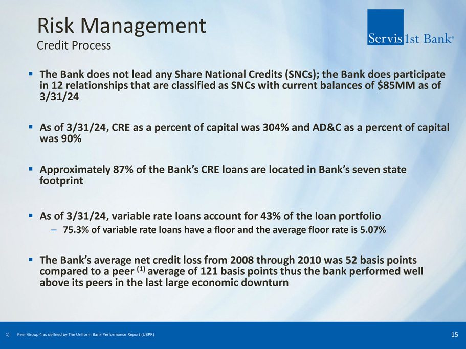 Risk Management Credit Process ▪ Lending focuses on middle market clients with Regional CEO and credit officers approving secured loan relationship up to $5MM; relationships greater than $5MM are approved by the CCO and/or members of executive management ▪ Centralized monitoring of ABL relationships greater than $2MM and centralized monitoring of commercial construction projects greater than $3MM ▪ Independent loan review examines 35 - 40% of the committed balances annually to affirm risk rating accuracy and proper documentation ▪ The top three industry exposures as of 3/31/24 are: Real Estate (36%), Service Industry (12%) and Retail (9%). – The top three C&I and C&I OOCRE portfolio industries are: Retail (17%), Manufacturing (10%), and Health Care (9%). C&I and C&I OOCRE loans account for 44% of the total loan portfolio 14