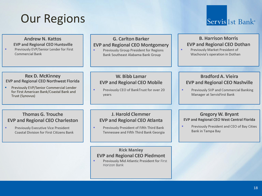 Our Management Team Thomas A. Broughton, III President and Chief Executive Officer ▪ Previously President and CEO of First Commercial Bank (acquired by Synovus Financial, 1992); subsequently, regional CEO for Synovus ▪ American Banker’s 2009 Community Banker of the Year Kirk P. Pressley EVP and Chief Financial Officer ▪ Previously Chief Financial Officer of BBVA USA ▪ Certified public accountant Rodney E. Rushing EVP and Chief Operating Officer ▪ Previously Executive Vice President of Correspondent Banking, BBVA - Compass 17 Henry F. Abbott SVP and Chief Credit Officer ▪ Previously Senior Vice President and Chief Credit Officer of the Correspondent Banking Division, ServisFirst Bank
