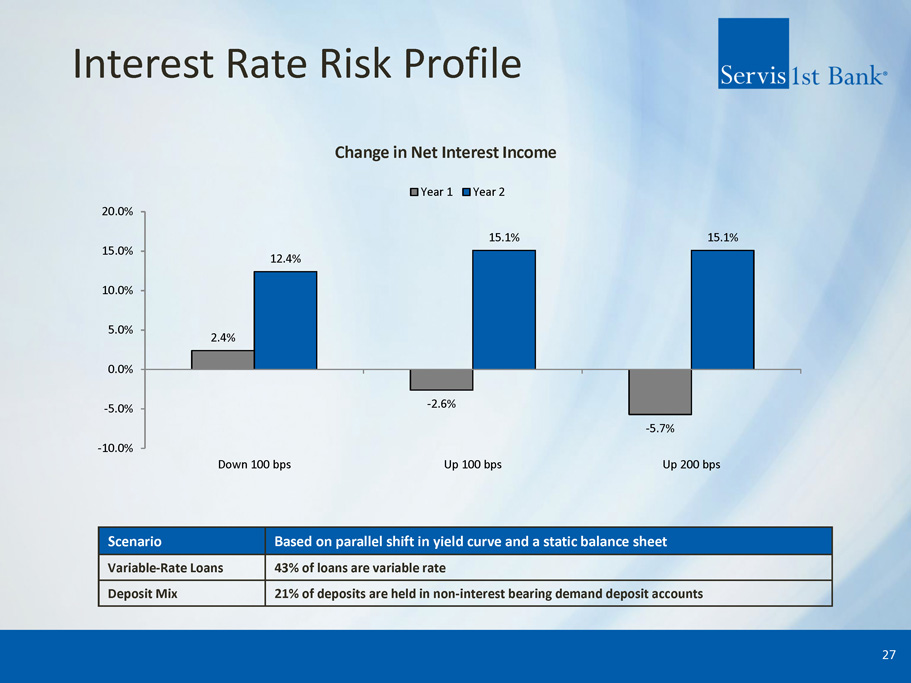 Efficiency ▪ Our operating structure and business strategy enable efficient, profitable growth 26 Core Efficiency Ratio (1) and Core Non - interest Expense / Average Assets (1) (1) (1) 1) For a reconciliation of these non - GAAP measures to the most comparable GAAP measure, see "GAAP Reconciliation and Management Explanation of Non - GAAP Financial Measures" included at the end of this presentation . 45.54% 41.54% 38.69% 38.75% 40.60% 39.47 34.71% 32.57% 33.28% 30.29% 31.84% 31.30% 38.28% 41.62% 1.79% 1.67% 1.51% 1.47% 1.55% 1.41 1.32% 1.26% 1.20% 1.05% 0.98% 1.07% 1.11% 1.12% 0.00% 0.50% 1.00% 1.50% 2.00% 2.50% 3.00% 3.50% 4.00% 4.50% 5.00% 0.00% 10.00% 20.00% 30.00% 40.00% 50.00% 60.00% 70.00% Core Efficiency Ratio Core noninterest expense/average assets