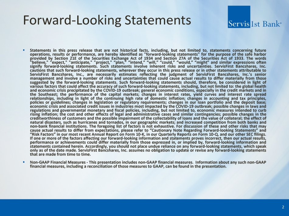 Forward - Looking Statements ▪ Statements in this press release that are not historical facts, including, but not limited to, statements concerning future operations, results or performance, are hereby identified as "forward - looking statements" for the purpose of the safe harbor provided by Section 21 E of the Securities Exchange Act of 1934 and Section 27 A of the Securities Act of 1933 . The words "believe," "expect," "anticipate," "project," “plan,” “intend,” “will,” “could,” “would,” “might” and similar expressions often signify forward - looking statements . Such statements involve inherent risks and uncertainties . ServisFirst Bancshares, Inc . cautions that such forward - looking statements, wherever they occur in this press release or in other statements attributable to ServisFirst Bancshares, Inc . , are necessarily estimates reflecting the judgment of ServisFirst Bancshares, Inc . ’s senior management and involve a number of risks and uncertainties that could cause actual results to differ materially from those suggested by the forward - looking statements . Such forward - looking statements should, therefore, be considered in light of various factors that could affect the accuracy of such forward - looking statements, including, but not limited to : the global health and economic crisis precipitated by the COVID - 19 outbreak ; general economic conditions, especially in the credit markets and in the Southeast ; the performance of the capital markets ; changes in interest rates, yield curves and interest rate spread relationships, including in light of the continuing high rate of domestic inflation ; changes in accounting and tax principles, policies or guidelines ; changes in legislation or regulatory requirements ; changes in our loan portfolio and the deposit base ; economic crisis and associated credit issues in industries most impacted by the COVID - 19 outbreak ; possible changes in laws and regulations and governmental monetary and fiscal policies, including, but not limited to, economic measures intended to curb rising inflation ; the cost and other effects of legal and administrative cases and similar contingencies ; possible changes in the creditworthiness of customers and the possible impairment of the collectability of loans and the value of collateral ; the effect of natural disasters, such as hurricanes and tornados, in our geographic markets ; and increased competition from both banks and non - bank financial institutions . The foregoing list of factors is not exhaustive . For discussion of these and other risks that may cause actual results to differ from expectations, please refer to “Cautionary Note Regarding Forward - looking Statements” and “Risk Factors” in our most recent Annual Report on Form 10 - K, in our Quarterly Reports on Form 10 - Q, and our other SEC filings . If one or more of the factors affecting our forward - looking information and statements proves incorrect, then our actual results, performance or achievements could differ materially from those expressed in, or implied by, forward - looking information and statements contained herein . Accordingly, you should not place undue reliance on any forward - looking statements, which speak only as of the date made . ServisFirst Bancshares, Inc . assumes no obligation to update or revise any forward - looking statements that are made from time to time . ▪ Non - GAAP Financial Measures - This presentation includes non - GAAP financial measures . Information about any such non - GAAP financial measures, including a reconciliation of those measures to GAAP, can be found in the presentation . 2