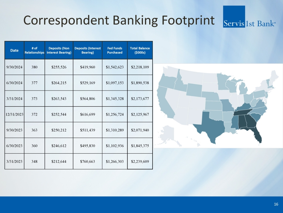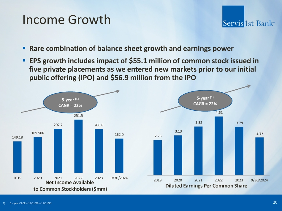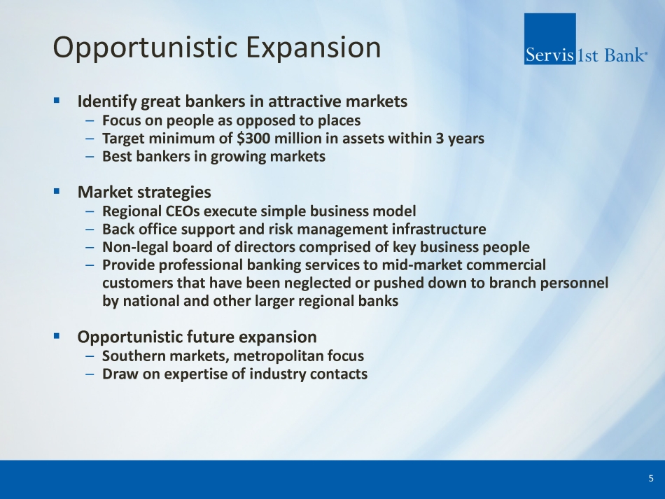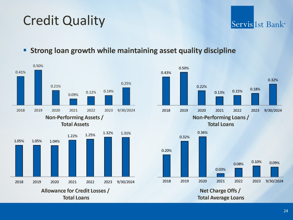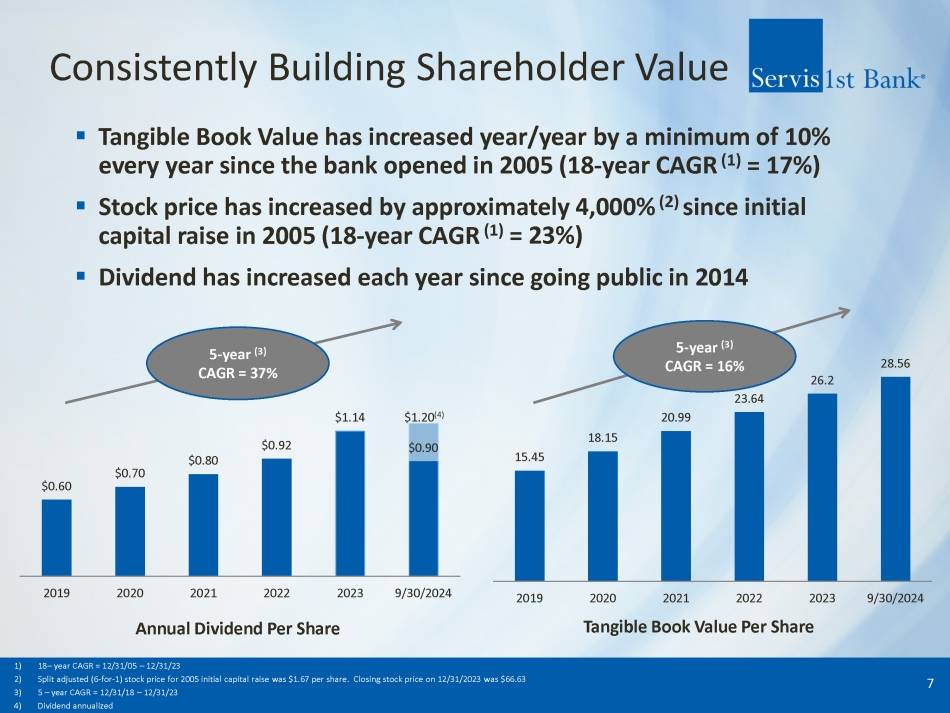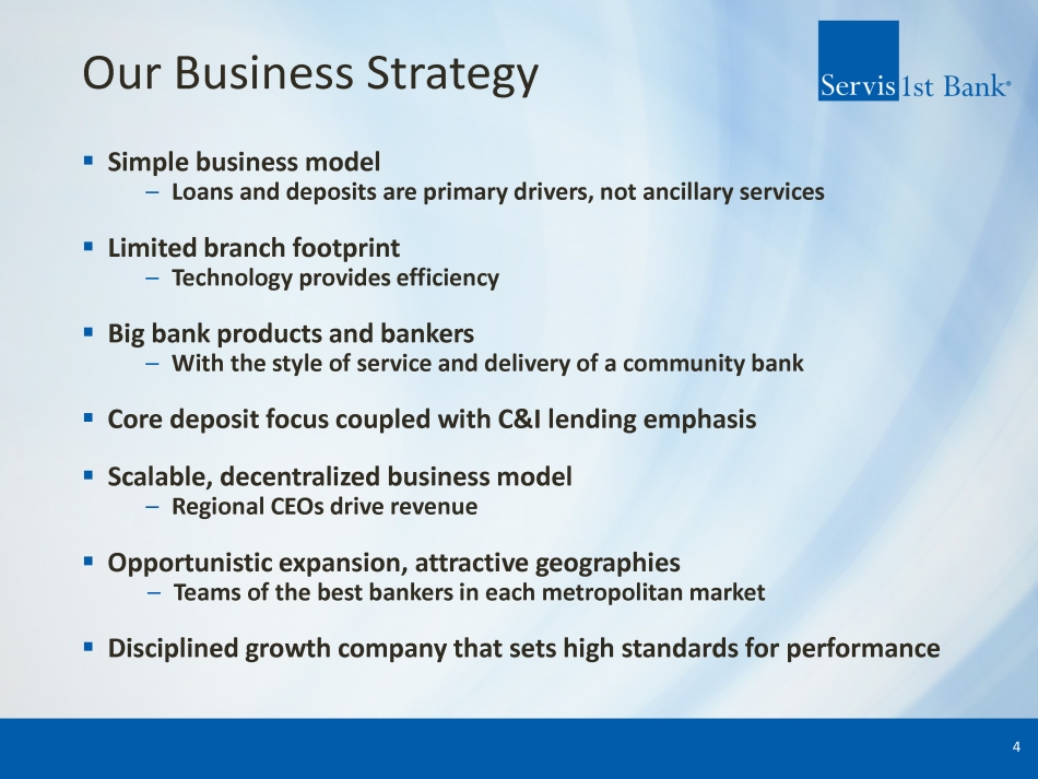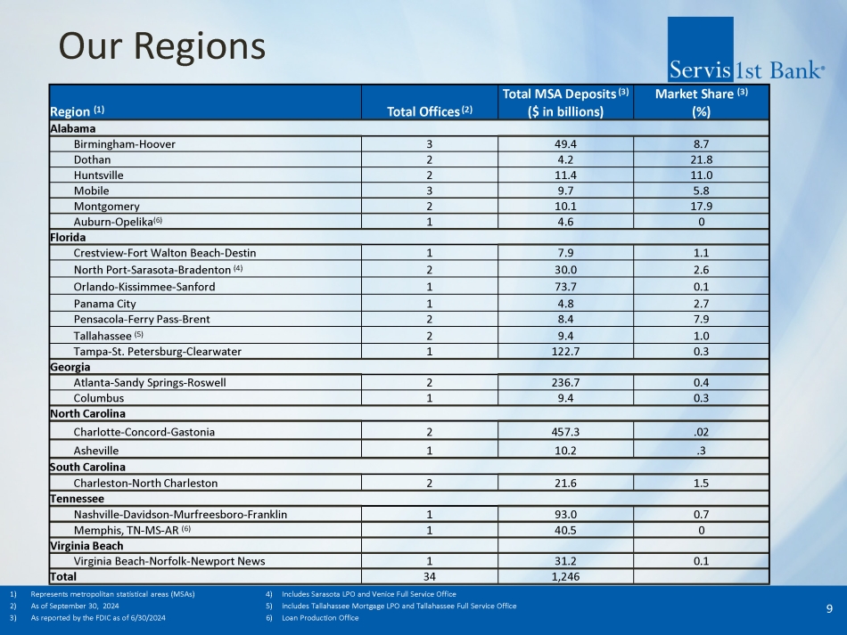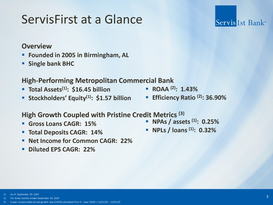 ServisFirst at a Glance Overview ▪ Founded in 2005 in Birmingham, AL ▪ Single bank BHC High - Performing Metropolitan Commercial Bank ▪ Total Assets (1) : $16.45 billion ▪ Stockholders’ Equity (1) : $1.57 billion High Growth Coupled with Pristine Credit Metrics (3) ▪ Gross Loans CAGR: 15% ▪ Total Deposits CAGR: 14% ▪ Net Income for Common CAGR: 22% ▪ Diluted EPS CAGR: 22% ▪ ROAA (2) : 1.43% ▪ Efficiency Ratio (2) : 36.90% 1) As of September 30, 2024 2) For three months ended September 30, 2024 3) 5 - year compounded annual growth rate (CAGR) calculated from 5 – year CAGR = 12/31/18 – 12/31/23 ▪ NPAs / assets (1) : 0.25% ▪ NPLs / loans (1) : 0.32% 3