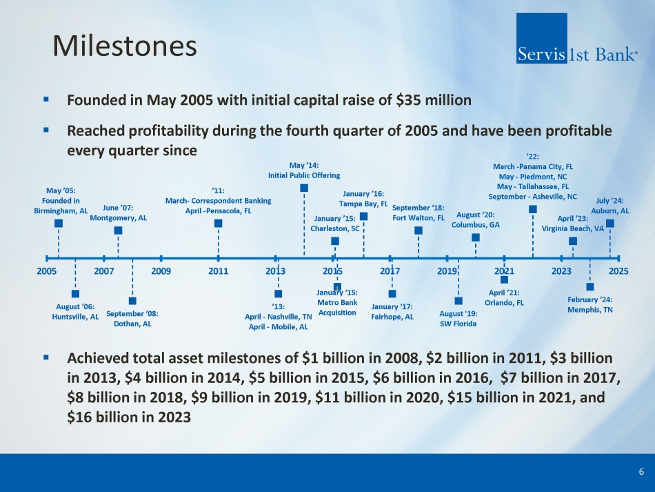 Opportunistic Expansion ▪ Identify great bankers in attractive markets – Focus on people as opposed to places – Target minimum of $300 million in assets within 3 years – Best bankers in growing markets ▪ Market strategies – Regional CEOs execute simple business model – Back office support and risk management infrastructure – Non - legal board of directors comprised of key business people – Provide professional banking services to mid - market commercial customers that have been neglected or pushed down to branch personnel by national and other larger regional banks ▪ Opportunistic future expansion – Southern markets, metropolitan focus – Draw on expertise of industry contacts 5
