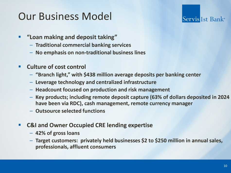Our Regions 9 1) Represents metropolitan statistical areas (MSAs) 4) Includes Sarasota LPO and Venice Full Service Office 2) As of September 30, 2024 5) includes Tallahassee Mortgage LPO and Tallahassee Full Service Office 3) As reported by the FDIC as of 6/30/2024 6) Loan Production Office Market Share (3) Total MSA Deposits (3) Total Offices (2) Region (1) (%) ($ in billions) Alabama 8.7 49.4 3 Birmingham - Hoover 21.8 4.2 2 Dothan 11.0 11.4 2 Huntsville 5.8 9.7 3 Mobile 17.9 10.1 2 Montgomery 0 4.6 1 Auburn - Opelika (6) Florida 1.1 7.9 1 Crestview - Fort Walton Beach - Destin 2.6 30.0 2 North Port - Sarasota - Bradenton (4) 0.1 73.7 1 Orlando - Kissimmee - Sanford 2.7 4.8 1 Panama City 7.9 8.4 2 Pensacola - Ferry Pass - Brent 1.0 9.4 2 Tallahassee (5) 0.3 122.7 1 Tampa - St. Petersburg - Clearwater Georgia 0.4 236.7 2 Atlanta - Sandy Springs - Roswell 0.3 9.4 1 Columbus North Carolina .02 457.3 2 Charlotte - Concord - Gastonia .3 10.2 1 Asheville South Carolina 1.5 21.6 2 Charleston - North Charleston Tennessee 0.7 93.0 1 Nashville - Davidson - Murfreesboro - Franklin 0 40.5 1 Memphis, TN - MS - AR (6) Virginia Beach 0.1 31.2 1 Virginia Beach - Norfolk - Newport News 1,246 34 Total