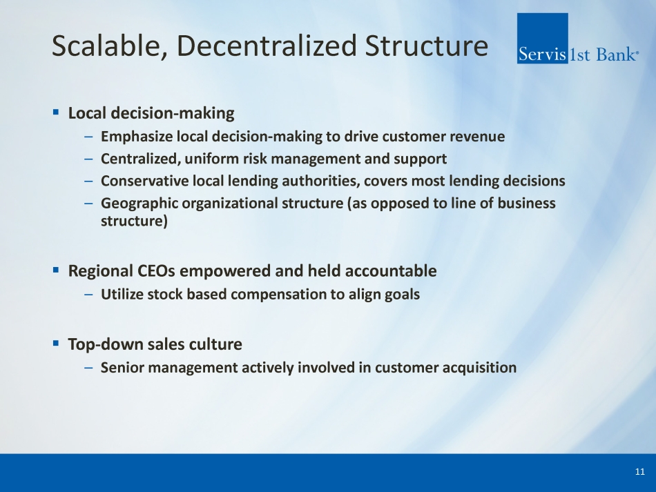Our Business Model ▪ “Loan making and deposit taking” – Traditional commercial banking services – No emphasis on non - traditional business lines ▪ Culture of cost control – “Branch light,” with $438 million average deposits per banking center – Leverage technology and centralized infrastructure – Headcount focused on production and risk management – Key products; including remote deposit capture (63% of dollars deposited in 2024 have been via RDC), cash management, remote currency manager – Outsource selected functions ▪ C&I and Owner Occupied CRE lending expertise – 42% of gross loans – Target customers: privately held businesses $2 to $250 million in annual sales, professionals, affluent consumers 10