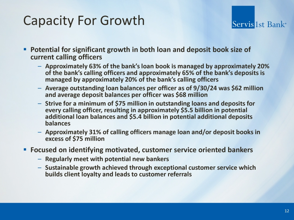 Scalable, Decentralized Structure ▪ Local decision - making – Emphasize local decision - making to drive customer revenue – Centralized, uniform risk management and support – Conservative local lending authorities, covers most lending decisions – Geographic organizational structure (as opposed to line of business structure) ▪ Regional CEOs empowered and held accountable – Utilize stock based compensation to align goals ▪ Top - down sales culture – Senior management actively involved in customer acquisition 11