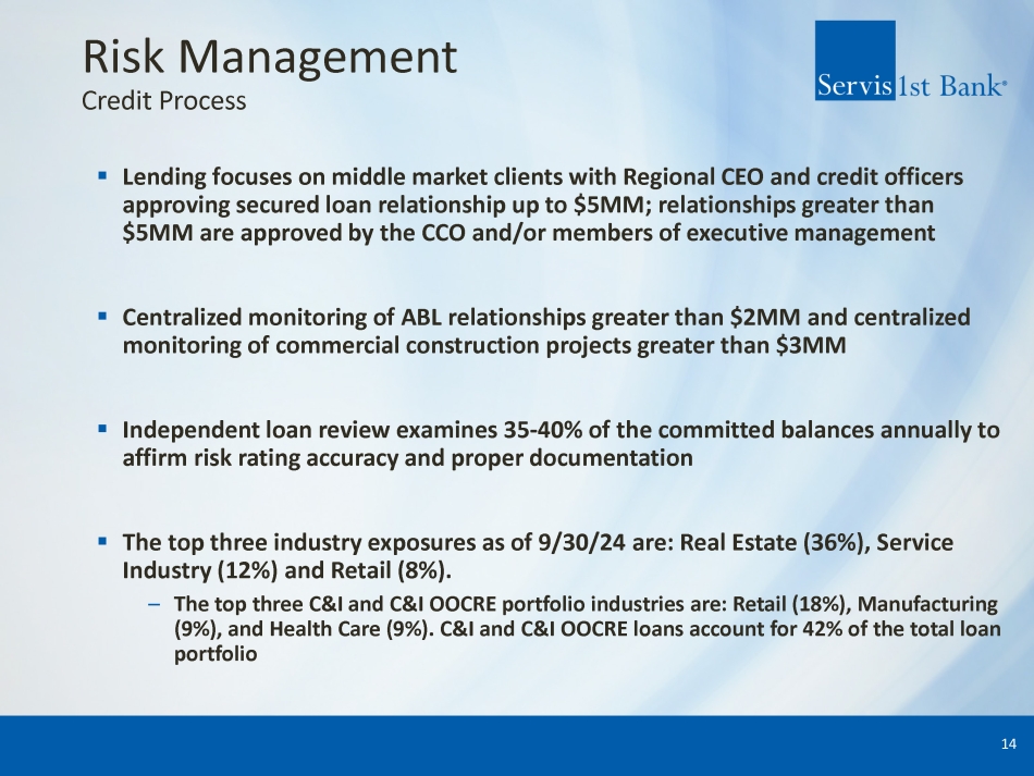 Risk Management ▪ Manage risk centrally while delivering products and services by each Regional Bank ▪ Centralized/Consistent: operations, compliance, risk, accounting, audit, information technology, and credit administration ▪ Investing resources in Risk Management Group – Hired CRO in 2017; implemented enterprise risk management program – Invested in new technologies (BSA, information security, credit administration) – Enhanced staff and resources for risk, compliance, BSA, and credit administration – Increased scope of internal audits and independent loan reviews ▪ Management committees identify, monitor, and mitigate risks across enterprise ▪ Healthy Regulatory relations ▪ Independent loan portfolio stress testing performed regularly ▪ Correspondent Banking Division provides additional stable funding source 13