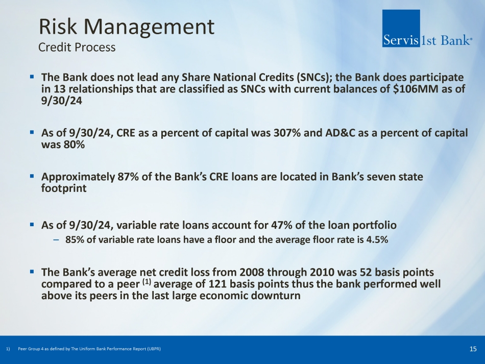 Risk Management Credit Process ▪ Lending focuses on middle market clients with Regional CEO and credit officers approving secured loan relationship up to $5MM; relationships greater than $5MM are approved by the CCO and/or members of executive management ▪ Centralized monitoring of ABL relationships greater than $2MM and centralized monitoring of commercial construction projects greater than $3MM ▪ Independent loan review examines 35 - 40% of the committed balances annually to affirm risk rating accuracy and proper documentation ▪ The top three industry exposures as of 9/30/24 are: Real Estate (36%), Service Industry (12%) and Retail (8%). – The top three C&I and C&I OOCRE portfolio industries are: Retail (18%), Manufacturing (9%), and Health Care (9%). C&I and C&I OOCRE loans account for 42% of the total loan portfolio 14