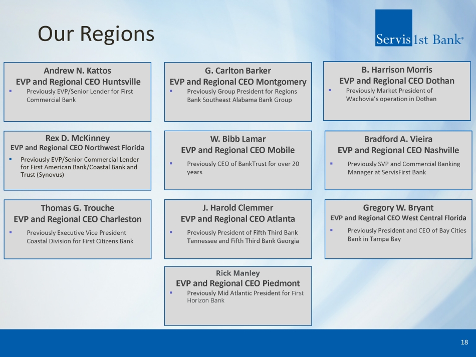 Our Management Team Thomas A. Broughton, III Chairman and Chief Executive Officer ▪ Previously President and CEO of First Commercial Bank (acquired by Synovus Financial, 1992); subsequently, regional CEO for Synovus ▪ American Banker’s 2009 Community Banker of the Year Edison K. Woodie SVP and Interim Chief Financial Officer ▪ Previously Senior Vice President and Controller of ServisFirst Bank ▪ Certified Public A ccountant Rodney E. Rushing EVP and Chief Operating Officer ▪ Previously Executive Vice President of Correspondent Banking, BBVA - Compass 17 Henry F. Abbott SVP and Chief Credit Officer ▪ Previously Senior Vice President and Chief Credit Officer of the Correspondent Banking Division, ServisFirst Bank