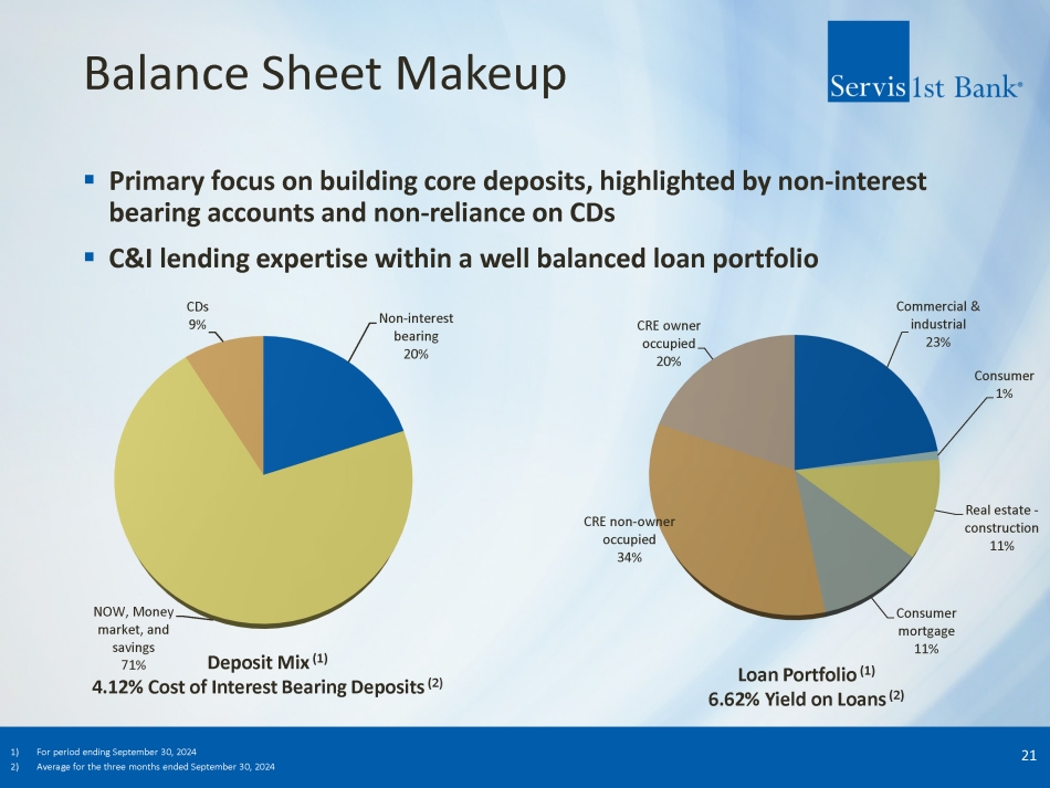 Income Growth ▪ Rare combination of balance sheet growth and earnings power ▪ EPS growth includes impact of $55.1 million of common stock issued in five private placements as we entered new markets prior to our initial public offering (IPO) and $56.9 million from the IPO 20 5 - year (1) CAGR = 22% 5 - year (1) CAGR = 22% Net Income Available to Common Stockholders ($mm) Diluted Earnings Per Common Share 1) 5 – year CAGR = 12/31/18 – 12/31/23 149.18 169.506 207.7 251.5 206.8 162.0 2019 2020 2021 2022 2023 9/30/2024 2.76 3.13 3.82 4.61 3.79 2.97 2019 2020 2021 2022 2023 9/30/2024