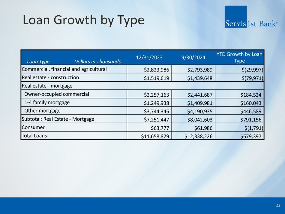 Loan Growth by Type 22 YTD Growth by Loan Type 9/30/2024 12/31/2023 Loan Type Dollars in Thousands $(29,997) $2,793,989 $2,823,986 Commercial, financial and agricultural $(79,971) $1,439,648 $1,519,619 Real estate - construction Real estate - mortgage $184,524 $2,441,687 $2,257,163 Owner - occupied commercial $160,043 $1,409,981 $1,249,938 1 - 4 family mortgage $446,589 $4,190,935 $3,744,346 Other mortgage $791,156 $8,042,603 $7,251,447 Subtotal: Real Estate - Mortgage $(1,791) $61,986 $63,777 Consumer $679,397 $12,338,226 $11,658,829 Total Loans