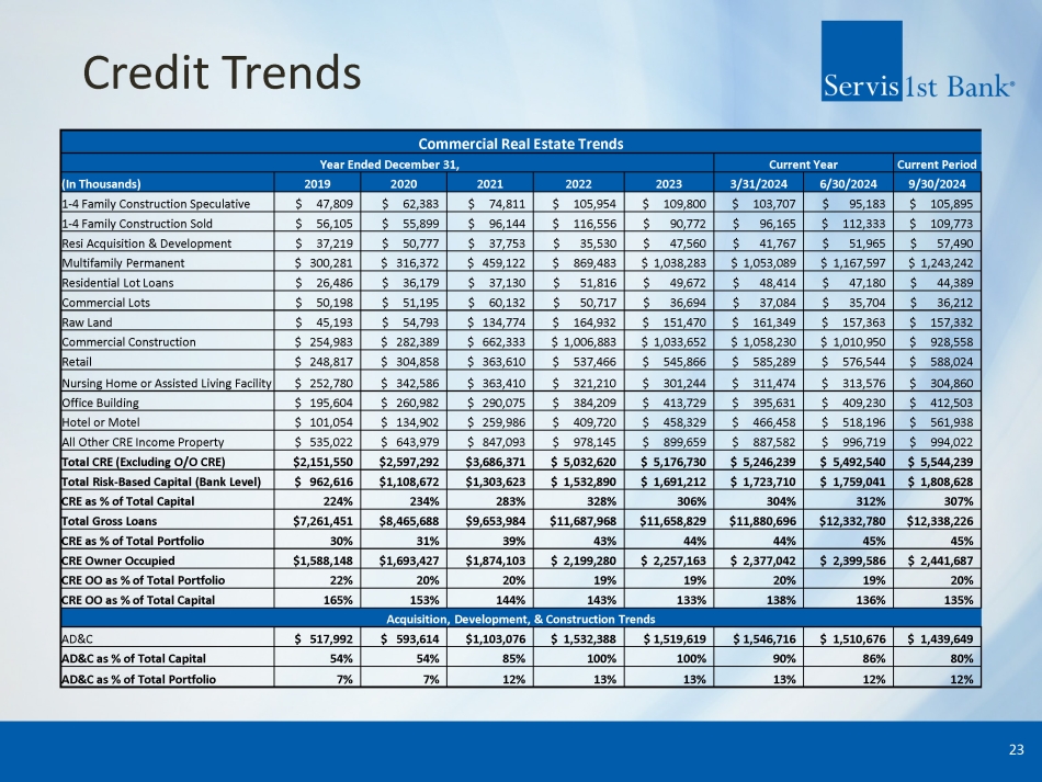 Credit Trends 23 Commercial Real Estate Trends Current Period Current Year Year Ended December 31, 9/30/2024 6/30/2024 3/31/2024 2023 2022 2021 2020 2019 (In Thousands) $ 105,895 $ 95,183 $ 103,707 $ 109,800 $ 105,954 $ 74,811 $ 62,383 $ 47,809 1 - 4 Family Construction Speculative $ 109,773 $ 112,333 $ 96,165 $ 90,772 $ 116,556 $ 96,144 $ 55,899 $ 56,105 1 - 4 Family Construction Sold $ 57,490 $ 51,965 $ 41,767 $ 47,560 $ 35,530 $ 37,753 $ 50,777 $ 37,219 Resi Acquisition & Development $ 1,243,242 $ 1,167,597 $ 1,053,089 $ 1,038,283 $ 869,483 $ 459,122 $ 316,372 $ 300,281 Multifamily Permanent $ 44,389 $ 47,180 $ 48,414 $ 49,672 $ 51,816 $ 37,130 $ 36,179 $ 26,486 Residential Lot Loans $ 36,212 $ 35,704 $ 37,084 $ 36,694 $ 50,717 $ 60,132 $ 51,195 $ 50,198 Commercial Lots $ 157,332 $ 157,363 $ 161,349 $ 151,470 $ 164,932 $ 134,774 $ 54,793 $ 45,193 Raw Land $ 928,558 $ 1,010,950 $ 1,058,230 $ 1,033,652 $ 1,006,883 $ 662,333 $ 282,389 $ 254,983 Commercial Construction $ 588,024 $ 576,544 $ 585,289 $ 545,866 $ 537,466 $ 363,610 $ 304,858 $ 248,817 Retail $ 304,860 $ 313,576 $ 311,474 $ 301,244 $ 321,210 $ 363,410 $ 342,586 $ 252,780 Nursing Home or Assisted Living Facility $ 412,503 $ 409,230 $ 395,631 $ 413,729 $ 384,209 $ 290,075 $ 260,982 $ 195,604 Office Building $ 561,938 $ 518,196 $ 466,458 $ 458,329 $ 409,720 $ 259,986 $ 134,902 $ 101,054 Hotel or Motel $ 994,022 $ 996,719 $ 887,582 $ 899,659 $ 978,145 $ 847,093 $ 643,979 $ 535,022 All Other CRE Income Property $ 5,544,239 $ 5,492,540 $ 5,246,239 $ 5,176,730 $ 5,032,620 $3,686,371 $2,597,292 $2,151,550 Total CRE (Excluding O/O CRE) $ 1,808,628 $ 1,759,041 $ 1,723,710 $ 1,691,212 $ 1,532,890 $1,303,623 $1,108,672 $ 962,616 Total Risk - Based Capital (Bank Level) 307% 312% 304% 306% 328% 283% 234% 224% CRE as % of Total Capital $12,338,226 $12,332,780 $11,880,696 $11,658,829 $11,687,968 $9,653,984 $8,465,688 $7,261,451 Total Gross Loans 45% 45% 44% 44% 43% 39% 31% 30% CRE as % of Total Portfolio $ 2,441,687 $ 2,399,586 $ 2,377,042 $ 2,257,163 $ 2,199,280 $1,874,103 $1,693,427 $1,588,148 CRE Owner Occupied 20% 19% 20% 19% 19% 20% 20% 22% CRE OO as % of Total Portfolio 135% 136% 138% 133% 143% 144% 153% 165% CRE OO as % of Total Capital Acquisition, Development, & Construction Trends $ 1,439,649 $ 1,510,676 $ 1,546,716 $ 1,519,619 $ 1,532,388 $1,103,076 $ 593,614 $ 517,992 AD&C 80% 86% 90% 100% 100% 85% 54% 54% AD&C as % of Total Capital 12% 12% 13% 13% 13% 12% 7% 7% AD&C as % of Total Portfolio