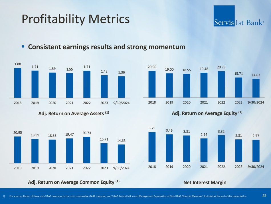 Credit Quality ▪ Strong loan growth while maintaining asset quality discipline 24 Allowance for Credit Losses / Total Loans Net Charge Offs / Total Average Loans Non - Performing Assets / Total Assets Non - Performing Loans / Total Loans 0.41% 0.50% 0.21% 0.09% 0.12% 0.14% 0.25% 2018 2019 2020 2021 2022 2023 9/30/2024 0.43% 0.50% 0.22% 0.13% 0.15% 0.18% 0.32% 2018 2019 2020 2021 2022 2023 9/30/2024 0.20% 0.32% 0.36% 0.03% 0.08% 0.10% 0.09% 2018 2019 2020 2021 2022 2023 9/30/2024 1.05% 1.05% 1.04% 1.22% 1.25% 1.32% 1.31% 2018 2019 2020 2021 2022 2023 9/30/2024