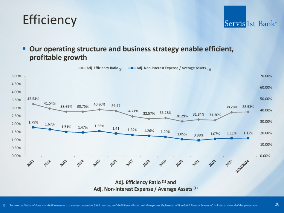 Profitability Metrics ▪ Consistent earnings results and strong momentum 25 Adj. Return on Average Assets (1) Adj. Return on Average Equity (1) Adj. Return on Average Common Equity (1) Net Interest Margin 1) For a reconciliation of these non - GAAP measures to the most comparable GAAP measure, see "GAAP Reconciliation and Management Exp lanation of Non - GAAP Financial Measures" included at the end of this presentation. 1.88 1.71 1.59 1.55 1.71 1.42 1.36 2018 2019 2020 2021 2022 2023 9/30/2024 20.96 19.00 18.55 19.48 20.73 15.71 14.63 2018 2019 2020 2021 2022 2023 9/30/2024 20.95 18.99 18.55 19.47 20.73 15.71 14.63 2018 2019 2020 2021 2022 2023 9/30/2024 3.75 3.46 3.31 2.94 3.32 2.81 2.77 2018 2019 2020 2021 2022 2023 9/30/2024