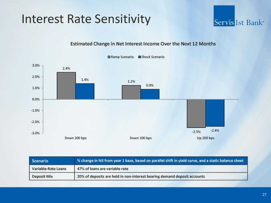 Efficiency ▪ Our operating structure and business strategy enable efficient, profitable growth 26 Adj. Efficiency Ratio (1) and Adj. Non - interest Expense / Average Assets (1) (1) (1) 1) For a reconciliation of these non - GAAP measures to the most comparable GAAP measure, see "GAAP Reconciliation and Management Explanation of Non - GAAP Financial Measures" included at the end of this presentation . 45.54% 41.54% 38.69% 38.75% 40.60% 39.47 34.71% 32.57% 33.28% 30.29% 31.84% 31.30% 38.28% 38.53% 1.79% 1.67% 1.51% 1.47% 1.55% 1.41 1.32% 1.26% 1.20% 1.05% 0.98% 1.07% 1.11% 1.12% 0.00% 0.50% 1.00% 1.50% 2.00% 2.50% 3.00% 3.50% 4.00% 4.50% 5.00% 0.00% 10.00% 20.00% 30.00% 40.00% 50.00% 60.00% 70.00% Adj. Efficiency Ratio Adj. Non-interest Expense / Average Assets