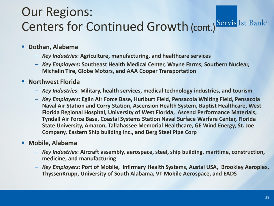 Our Regions: Centers for Continued Growth ▪ Birmingham, Alabama – Key Industries : Metals manufacturing, finance, insurance, healthcare services and distribution – Key Employers : Protective Life, Encompass Health, Vulcan Materials Company, AT&T, American Cast Iron Pipe Company, Southern Company, Shipt , and University of Alabama at Birmingham ▪ Huntsville, Alabama – Key Industries : U.S. government, aerospace/defense, commercial and university research – Key Employers : U.S. Army/Redstone Arsenal, Boeing Company, NASA/Marshall Space Flight Center, Intergraph Corporation, ADTRAN, Northrop Grumman, Technicolor, SAIC, DirecTV, Lockheed Martin, and Toyota Motor Manufacturing ▪ Montgomery, Alabama – Key Industries : U.S. and state government, U.S. Air Force , automotive manufacturing – Key Employers : Maxwell Gunter Air Force Base, State of Alabama, Baptist Health Systems, Hyundai Motor Manufacturing, and MOBIS Alabama 28