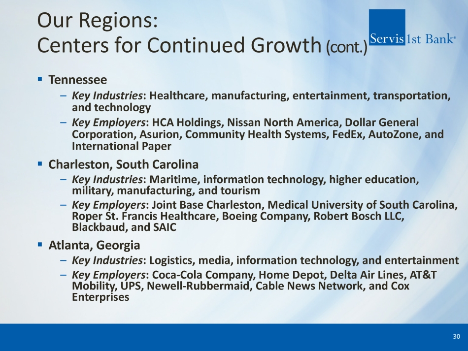 Our Regions: Centers for Continued Growth (cont.) ▪ Dothan, Alabama – Key Industries : Agriculture, manufacturing, and healthcare services – Key Employers : Southeast Health Medical Center, Wayne Farms, Southern Nuclear, Michelin Tire, Globe Motors, and AAA Cooper Transportation ▪ Northwest Florida – Key Industries : Military, health services, medical technology industries, and tourism – Key Employers : Eglin Air Force Base, Hurlburt Field, Pensacola Whiting Field, Pensacola Naval Air Station and Corry Station, Ascension Health System, Baptist Healthcare, West Florida Regional Hospital, University of West Florida, Ascend Performance Materials, Tyndall Air Force Base, Coastal Systems Station Naval Surface Warfare Center, Florida State University, Amazon, Tallahassee Memorial Healthcare, GE Wind Energy, St. Joe Company, Eastern Ship building Inc., and Berg Steel Pipe Corp ▪ Mobile, Alabama – Key Industries : Aircraft assembly, aerospace, steel, ship building, maritime, construction, medicine, and manufacturing – Key Employers : Port of Mobile, Infirmary Health Systems, Austal USA, Brookley Aeroplex , ThyssenKrupp, University of South Alabama, VT Mobile Aerospace, and EADS 29