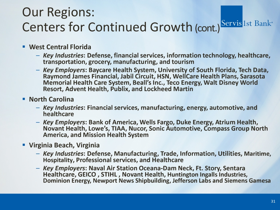 Our Regions: Centers for Continued Growth (cont.) ▪ Tennessee – Key Industries : Healthcare, manufacturing, entertainment, transportation, and technology – Key Employers : HCA Holdings, Nissan North America, Dollar General Corporation, Asurion, Community Health Systems, FedEx, AutoZone, and International Paper ▪ Charleston, South Carolina – Key Industries : Maritime, information technology, higher education, military, manufacturing, and tourism – Key Employers : Joint Base Charleston, Medical University of South Carolina, Roper St. Francis Healthcare, Boeing Company, Robert Bosch LLC, Blackbaud, and SAIC ▪ Atlanta, Georgia – Key Industries : Logistics, media, information technology, and entertainment – Key Employers : Coca - Cola Company, Home Depot, Delta Air Lines, AT&T Mobility, UPS, Newell - Rubbermaid, Cable News Network, and Cox Enterprises 30