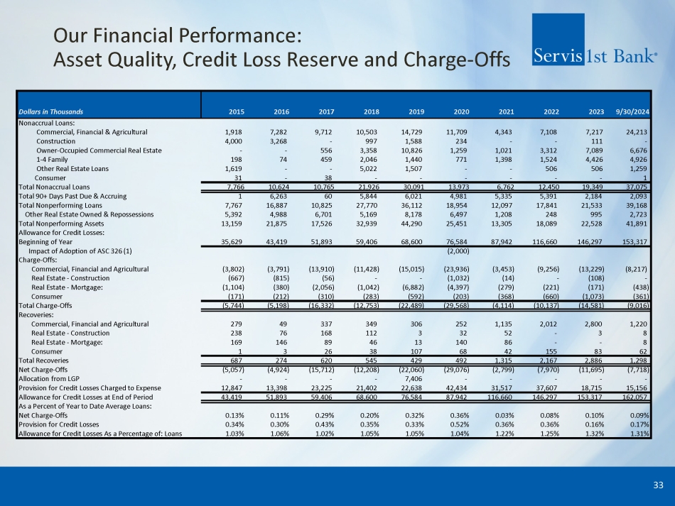 Our Financial Performance: Key Operating and Performance Metrics 32 1) For a reconciliation of these non - GAAP measures to the most comparable GAAP measure, see "GAAP Reconciliation and Management Exp lanation of Non - GAAP Financial Measures" included at the end of this presentation. 2) Non - GAAP financial measures. "Tangible Common Equity to Tangible Assets" and "Tangible Book value per Share" are not measures o f financial performance recognized by generally accepted accounting principles in the United States, or GAAP. Dollars in Millions Except per Share Amounts 9/30/2024 2023 2022 2021 2020 2019 2018 2017 2016 2015 Balance Sheet $16,448 $16,1 29 $14,596 $15,449 $11,933 $ 8 , 948 $8,007 $7,082 $6,370 $5,096 Total Assets $12,176 $11,506 $11,542 $9,416 $8,378 $ 7 , 185 $6,465 $5,792 $4,860 $4,173 Net Loans $13,147 $13,274 $11,547 $12,453 $9,976 $ 7 , 530 $6,916 $6,092 $5,420 $4,224 Deposits 93% 87% 100% 76% 84% 95% 93% 95% 90% 99% Net Loans / Deposits $1,570 $1,440 $1,298 $1,152 $993 $843 $715 $608 $523 $449 Total Equity Profitability $162.1 $206.9 $251.5 $207.7 $169.6 $149.2 $136.9 $93.1 $81.5 $63.5 Net Income $162.0 $206.8 $251.4 $207.7 $169.5 $149.2 $136.9 $93.0 $81.4 $63.3 Net Income Available to Common $16 3 . 4 $2 14 . 6 $251.4 $210.0 $169.5 $147.9 $136.9 $96.3 $81.4 $65.0 Adj. Net Income Available to Common (1) 1.3 6 % 1. 42 % 1.71% 1.55% 1.59% 1.71% 1.88% 1.48% 1.42% 1.42% Adj. ROAA (1) 14. 63 % 15. 71 % 20.73% 19.48% 18.55% 19.00% 20.96% 16.96% 16.64% 14.96% Adj. ROAE (1) 14. 63 % 15. 71 % 20.73% 19.47% 18.55% 18.99% 20.95% 16.95% 16.63% 15.73% Adj. ROACE (1) 2.77% 2.81% 3.32% 2.94% 3.31% 3.46% 3.75% 3.68% 3.42% 3.75% Net Interest Margin 38.53% 38.28 % 31.30% 31.84% 30.29% 33.31% 32.57% 34.71% 39.47% 40.73% Adj. Efficiency Ratio (1) Capital Adequacy 9.47% 8.85% 8.81% 7.38% 8.22% 9.27% 8.77% 8.39% 7.99% 8.54% Tangible Common Equity to Tangible Assets (2) 11.25% 10 . 91% 9.55% 9.95% 10.50% 10.50% 10.12% 9.51% 9.78% 0.0972 Common Equity Tier 1 RBC Ratio 9.54% 9.12% 9.29% 7.39% 8.23% 9.13% 9.07% 8.51% 8.22% 8.55% Tier I Leverage Ratio 11.25% 10.92% 9.55% 9.96% 10.50% 10.50% 10.13% 9.52% 9.78% 9.73% Tier I RBC Ratio 12.77% 12.45% 11.03% 11.58% 12.20% 12.31% 12.05% 11.52% 11.84% 11.95% Total RBC Ratio Asset Quality 0. 25 % 0.1 4 % 0.12% 0.09% 0.21% 0.50% 0.41% 0.25% 0.34% 0.26% NPAs / Assets 0.0 9 % 0. 10 % 0.08% 0.03% 0.36% 0.32% 0.20% 0.00% 0.11% 0.13% NCOs / Average Loans 1.31% 1.32% 1.25% 1.22% 1.04% 1.05% 1.05% 1.02% 1.06% 1.03% Credit Loss Reserve / Gross Loans Per Share Information 54,551,543 54,461,580 54,326,527 54,227,060 53,943,751 53,623,740 53,375,195 52,992,586 52,636,896 51,945,396 Common Shares Outstanding $28.79 $26.45 $23.89 $21.24 $18.41 $15.71 $13.40 $11.47 $9.93 $8.65 Book Value per Share $28.54 $26.20 $23.64 $20.99 $18.15 $15.45 $13.13 $11.19 $9.65 $8.35 Tangible Book Value per Share (2) $2.97 $3.79 $4.61 $3.82 $3.13 $2.76 $2.53 $1.72 $1.52 $1.20 Diluted Earnings per Share $2.9 9 $3. 94 $4.61 $3.86 $3.13 $2.74 $2.53 $1.78 $1.52 $1.23 Adj. Diluted Earnings per Share (1)