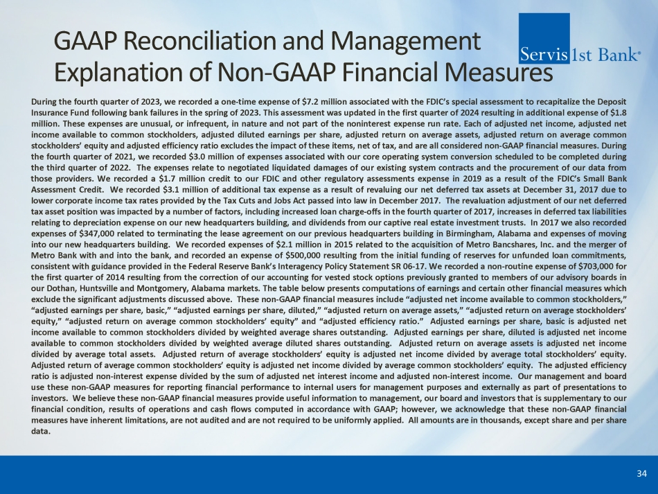 GAAP Reconciliation and Management Explanation of Non - GAAP Financial Measures During the fourth quarter of 2023 , we recorded a one - time expense of $ 7 . 2 million associated with the FDIC’s special assessment to recapitalize the Deposit Insurance Fund following bank failures in the spring of 2023 . This assessment was updated in the first quarter of 2024 resulting in additional expense of $ 1 . 8 million . These expenses are unusual, or infrequent, in nature and not part of the noninterest expense run rate . Each of adjusted net income, adjusted net income available to common stockholders, adjusted diluted earnings per share, adjusted return on average assets, adjusted return on average common stockholders’ equity and adjusted efficiency ratio excludes the impact of these items, net of tax, and are all considered non - GAAP financial measures . During the fourth quarter of 2021 , we recorded $ 3 . 0 million of expenses associated with our core operating system conversion scheduled to be completed during the third quarter of 2022 . The expenses relate to negotiated liquidated damages of our existing system contracts and the procurement of our data from those providers . We recorded a $ 1 . 7 million credit to our FDIC and other regulatory assessments expense in 2019 as a result of the FDIC’s Small Bank Assessment Credit . We recorded $ 3 . 1 million of additional tax expense as a result of revaluing our net deferred tax assets at December 31 , 2017 due to lower corporate income tax rates provided by the Tax Cuts and Jobs Act passed into law in December 2017 . The revaluation adjustment of our net deferred tax asset position was impacted by a number of factors, including increased loan charge - offs in the fourth quarter of 2017 , increases in deferred tax liabilities relating to depreciation expense on our new headquarters building, and dividends from our captive real estate investment trusts . In 2017 we also recorded expenses of $ 347 , 000 related to terminating the lease agreement on our previous headquarters building in Birmingham, Alabama and expenses of moving into our new headquarters building . We recorded expenses of $ 2 . 1 million in 2015 related to the acquisition of Metro Bancshares, Inc . and the merger of Metro Bank with and into the bank, and recorded an expense of $ 500 , 000 resulting from the initial funding of reserves for unfunded loan commitments, consistent with guidance provided in the Federal Reserve Bank’s Interagency Policy Statement SR 06 - 17 . We recorded a non - routine expense of $ 703 , 000 for the first quarter of 2014 resulting from the correction of our accounting for vested stock options previously granted to members of our advisory boards in our Dothan, Huntsville and Montgomery, Alabama markets . The table below presents computations of earnings and certain other financial measures which exclude the significant adjustments discussed above . These non - GAAP financial measures include “adjusted net income available to common stockholders,” “adjusted earnings per share, basic,” “adjusted earnings per share, diluted,” “adjusted return on average assets,” “adjusted return on average stockholders’ equity,” “adjusted return on average common stockholders’ equity” and “adjusted efficiency ratio . ” Adjusted earnings per share, basic is adjusted net income available to common stockholders divided by weighted average shares outstanding . Adjusted earnings per share, diluted is adjusted net income available to common stockholders divided by weighted average diluted shares outstanding . Adjusted return on average assets is adjusted net income divided by average total assets . Adjusted return of average stockholders’ equity is adjusted net income divided by average total stockholders’ equity . Adjusted return of average common stockholders’ equity is adjusted net income divided by average common stockholders’ equity . The adjusted efficiency ratio is adjusted non - interest expense divided by the sum of adjusted net interest income and adjusted non - interest income . Our management and board use these non - GAAP measures for reporting financial performance to internal users for management purposes and externally as part of presentations to investors . We believe these non - GAAP financial measures provide useful information to management, our board and investors that is supplementary to our financial condition, results of operations and cash flows computed in accordance with GAAP ; however, we acknowledge that these non - GAAP financial measures have inherent limitations, are not audited and are not required to be uniformly applied . All amounts are in thousands, except share and per share data . 34