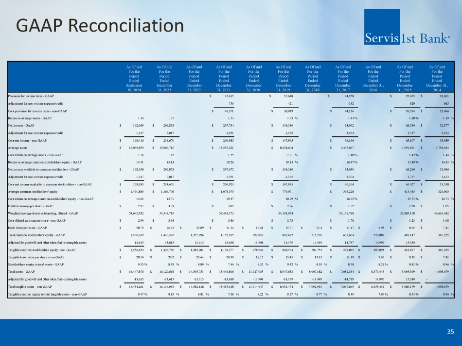 GAAP Reconciliation 35 As Of and For the Period Ended December 31, 2014 As Of and For the Period Ended December 31, 2015 As Of and For the Period Ended December 31, 2016 As Of and For the Period Ended December 31, 2017 As Of and For the Period Ended December 31, 2018 As Of and For the Period Ended December 31, 2019 As Of and For the Period Ended December 31, 2020 As Of and For the Period Ended December 31, 2021 As Of and For the Period Ended December 31, 2022 As Of and For the Period Ended December 31, 2023 As Of and For the Period Ended September 30, 2024 21,601 $ 25,465 $ 44,258 $ 37,618 $ 45,615 $ Provision for income taxes - GAAP 865 829 - 132 421 756 Adjustment for non - routine expense/credit 22,466 $ 26,294 $ 44,126 $ 38,039 $ 46,371 $ Core provision for income taxes - non - GAAP % 1.39 % 1.38 % 1.43 % 1.73 1.53 1.37 1.34 Return on average assets - GAAP 52,377 $ 63,540 $ 93,092 $ 149,180 $ 207,734 $ 206,853 $ 162,069 $ Net income - GAAP 1,612 1,767 3,274 - 1,185 2,251 7,817 1,347 Adjustment for non - routine expense/credit 53,989 $ 65,307 $ 96,366 $ 147,995 $ 209,985 $ 214,670 $ 163,416 $ Core net income - non - GAAP 3,758,184 $ 4,591,861 $ 6,495,067 $ 8,638,604 $ 13,555,221 $ 15,066,716 $ 16,095,859 $ Average assets % 1.44 % 1.42 % 1.48 % 1.71 1.55 1.42 1.36 Core return on average assets - non - GAAP % 14.43 % 15.30 % 16.37 % 19.15 19.26 15.13 14.51 Return on average common stockholders' equity - GAAP 51,946 $ 63,260 $ 93,030 $ 149,180 $ 207,672 $ 206,853 $ 162,038 $ Net income available to common stockholders - GAAP 1,612 1,767 3,274 - 1,185 2,251 7,817 1,347 Adjustment for non - routine expense/credit 53,558 $ 65,027 $ 96,304 $ 147,995 $ 209,923 $ 214,670 $ 163,385 $ Core net income available to common stockholders - non - GAAP 320,005 $ 413,445 $ 568,228 $ 779,071 $ 1,078,075 $ 1,366,708 $ 1,491,880 $ Average common stockholders' equity % 16.74 % 15.73 % 16.95 % 18.99 19.47 15.71 14.63 Core return on average common stockholders' equity - non - GAAP 1.05 $ 1.20 $ 1.72 $ 2.76 $ 3.82 $ 3.79 $ 2.97 $ Diluted earnings per share - GAAP 49,636,442 52,885,108 54,161,788 54,103,074 54,434,573 54,548,719 54,642,582 Weighted average shares outstanding, diluted - GAAP 1.08 $ 1.23 $ 1.78 $ 2.73 $ 3.86 $ 3.94 $ 2.99 $ Core diluted earnings per share - non - GAAP 7.41 $ 8.65 $ 9.93 $ 11.47 $ 13.4 $ 15.71 $ 18.41 $ 21.24 $ 23.89 $ 26.45 $ 28.79 $ Book value per share - GAAP 367,255 449,147 522,889 607,604 715,203 842,682 992,852 1,152,015 1,297,896 1,440,405 1,570,269 Total common stockholders' equity - GAAP - 15,330 14,996 14,787 14,449 14,179 13,908 13,638 13,615 13,615 13,615 Adjusted for goodwill and other identifiable intangible assets 367,255 $ 433,817 $ 507,893 $ 592,885 $ 700,754 $ 828,503 $ 978,944 $ 1,138,377 $ 1,284,281 $ 1,426,790 $ 1,556,654 $ Tangible common stockholders' equity - non - GAAP 7.41 $ 8.35 $ 9.65 $ 11.19 $ 13.13 $ 15.45 $ 18.15 $ 20.99 $ 23.64 $ 26.2 $ 28.54 $ Tangible book value per share - non - GAAP % 8.96 % 8.81 % 8.21 8.58 % 8.93 % 9.42 % 8.32 % 7.46 % 8.89 % 8.93 % 9.55 Stockholders' equity to total assets - GAAP 4,098,679 $ 5,095,509 $ 6,370,448 $ 7,082,384 $ 8,007,382 $ 8,947,653 $ 11,927,955 $ 15,448,806 $ 14,595,753 $ 16,129,668 $ 16,447,876 $ Total assets - GAAP - 15,330 14,996 - 14,719 - 14,449 - 14,179 - 13,908 - 13,638 - 13,615 - 13,615 - 13,615 Adjusted for goodwill and other identifiable intangible assets 4,098,679 $ 5,080,179 $ 6,355,452 $ 7,067,665 $ 7,992,933 $ 8,933,474 $ 11,914,047 $ 15,435,168 $ 14,582,138 $ 16,116,053 $ 16,434,261 $ Total tangible assets - non - GAAP % 8.96 % 8.54 % 7.99 8.39 % 8.77 % 9.27 % 8.22 % 7.38 % 8.81 % 8.85 % 9.47 Tangible common equity to total tangible assets - non - GAAP
