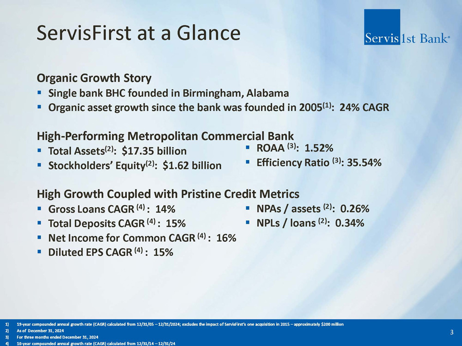 Forward - Looking Statements ▪ Statements in this presentation that are not historical facts, including, but not limited to, statements concerning future operations, results or performance, are hereby identified as "forward - looking statements" for the purpose of the safe harbor provided by Section 21 E of the Securities Exchange Act of 1934 and Section 27 A of the Securities Act of 1933 . The words "believe," "expect," "anticipate," "project," “plan,” “intend,” “will,” “could,” “would,” “might” and similar expressions often signify forward - looking statements . Such statements involve inherent risks and uncertainties . ServisFirst Bancshares, Inc . cautions that such forward - looking statements, wherever they occur in this presentation or in other statements attributable to ServisFirst Bancshares, Inc . , are necessarily estimates reflecting the judgment of ServisFirst Bancshares, Inc . ’s senior management and involve risks and uncertainties that could cause actual results to differ materially from those suggested by the forward - looking statements . Such forward - looking statements should, therefore, be considered in light of various factors that could affect the accuracy of such forward - looking statements, including, but not limited to : general economic conditions, especially in the credit markets and in the Southeast ; the performance of the capital markets ; changes in interest rates, yield curves and interest rate spread relationships ; changes in accounting and tax principles, policies or guidelines ; changes in legislation or regulatory requirements ; changes as a result of our reclassification as a large financial institution by the FDIC ; changes in our loan portfolio and the deposit base ; possible changes in laws and regulations and governmental monetary and fiscal policies, including, but not limited to, the Federal Reserve policies in connection with continued or re - emerging inflationary pressures and the ability of the U . S . Congress to increase the U . S . statutory debt limit as needed ; computer hacking or cyber - attacks resulting in unauthorized access to confidential or proprietary information ; substantial, unexpected or prolonged changes in the level or cost of liquidity ; the cost and other effects of legal and administrative cases and similar contingencies ; possible changes in the creditworthiness of customers and the possible impairment of the collectability of loans and the value of collateral ; the effect of natural disasters, such as hurricanes and tornados, in our geographic markets ; and increased competition from both banks and non - bank financial institutions . For discussion of these and other risks that may cause actual results to differ from expectations, please refer to “Cautionary Note Regarding Forward - looking Statements” and “Risk Factors” in our most recent Annual Report on Form 10 - K, in our Quarterly Reports on Form 10 - Q for fiscal year 2024 , and our other SEC filings . If one or more of the assumption forming the basis of our forward - looking information and statements proves incorrect, then our actual results, performance or achievements could differ materially from those expressed in, or implied by, forward - looking information and statements contained herein . Accordingly, you should not place undue reliance on any forward - looking statements, which speak only as of the date made . ServisFirst Bancshares, Inc . assumes no obligation to update or revise any forward - looking statements that are made from time to time . ▪ Non - GAAP Financial Measures - This presentation includes non - GAAP financial measures . Information about any such non - GAAP financial measures, including a reconciliation of those measures to GAAP, can be found in the presentation . 2