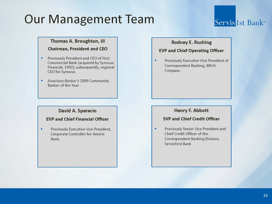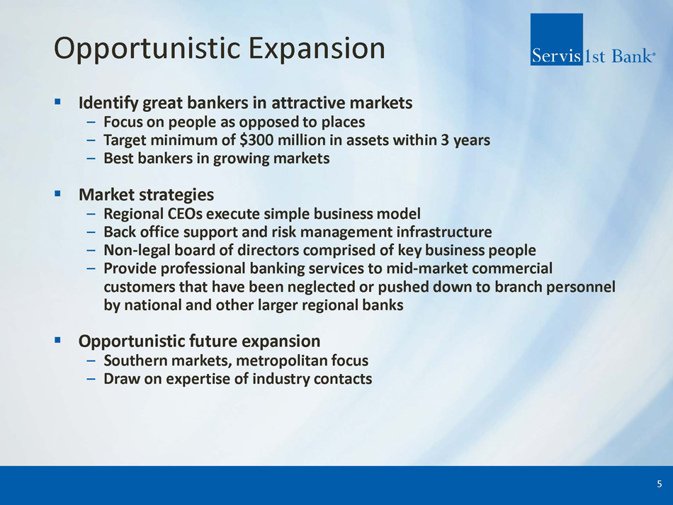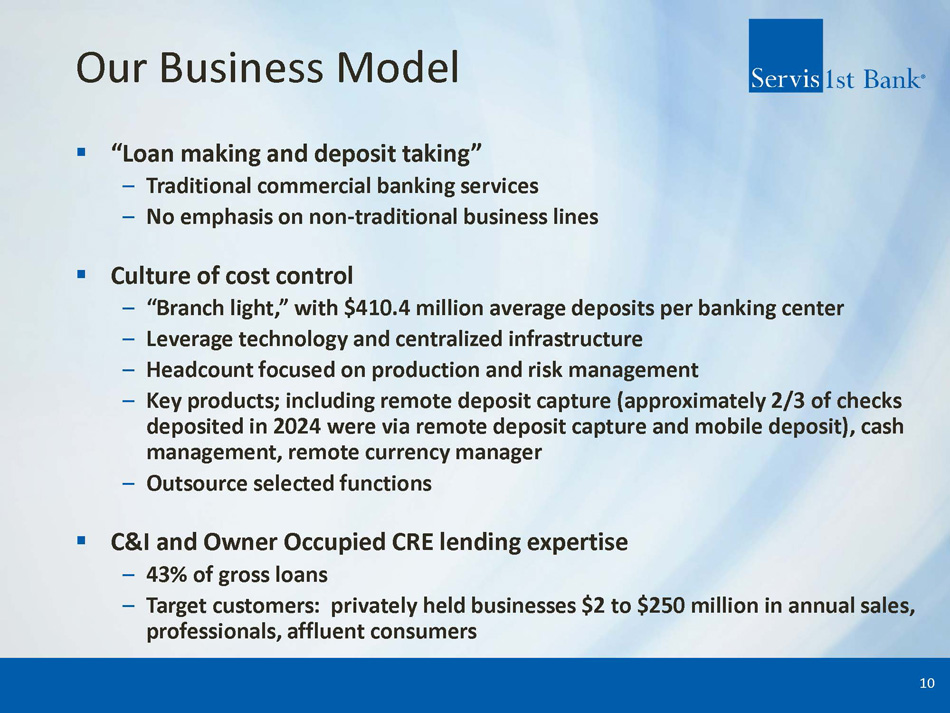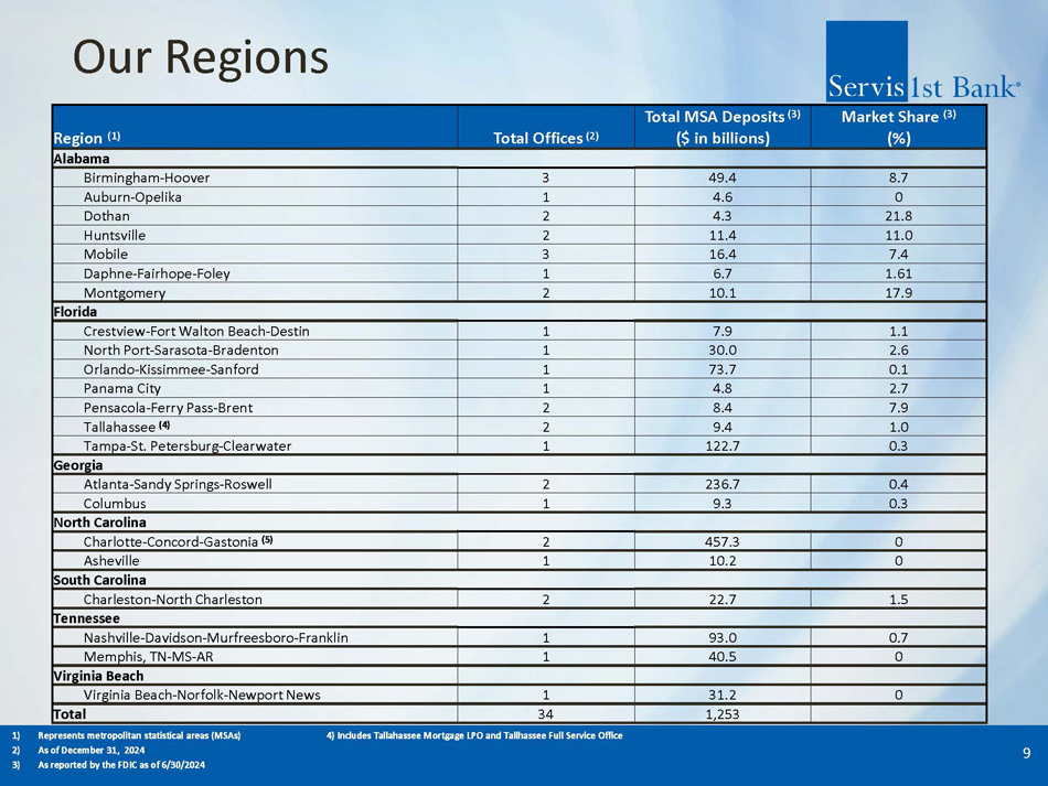 ServisFirst at a Glance Organic Growth Story ▪ Single bank BHC founded in Birmingham, Alabama ▪ Organic asset growth since the bank was founded in 2005 (1) : 24% CAGR High - Performing Metropolitan Commercial Bank ▪ Total Assets (2) : $17.35 billion ▪ Stockholders’ Equity (2) : $1.62 billion High Growth Coupled with Pristine Credit Metrics ▪ Gross Loans CAGR (4) : 14% ▪ Total Deposits CAGR (4) : 15% ▪ Net Income for Common CAGR (4) : 16% ▪ Diluted EPS CAGR (4) : 15% ▪ ROAA (3) : 1.52% ▪ Efficiency Ratio (3) : 35.54% 1) 19 - year compounded annual growth rate (CAGR) calculated from 12/31/05 – 12/31/2024; excludes the impact of ServisFirst’s one acquisition in 2015 – approximately $200 million 2) As of December 31, 2024 3) For three months ended December 31, 2024 4) 10 - year compounded annual growth rate (CAGR) calculated from 12/31/14 – 12/31/24 ▪ NPAs / assets (2) : 0.26% ▪ NPLs / loans (2) : 0.34% 3