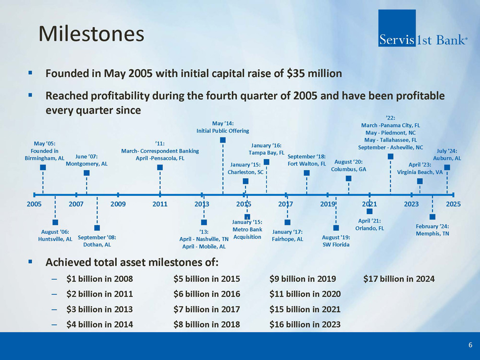 Opportunistic Expansion ▪ Identify great bankers in attractive markets – Focus on people as opposed to places – Target minimum of $300 million in assets within 3 years – Best bankers in growing markets ▪ Market strategies – Regional CEOs execute simple business model – Back office support and risk management infrastructure – Non - legal board of directors comprised of key business people – Provide professional banking services to mid - market commercial customers that have been neglected or pushed down to branch personnel by national and other larger regional banks ▪ Opportunistic future expansion – Southern markets, metropolitan focus – Draw on expertise of industry contacts 5