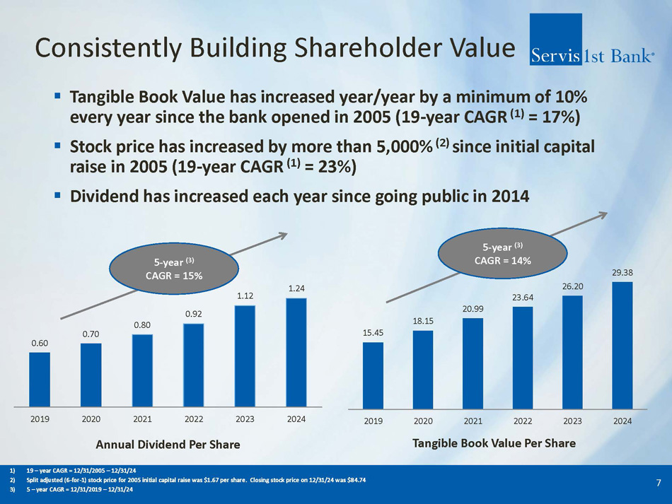 Milestones 6 ▪ Founded in May 2005 with initial capital raise of $35 million ▪ Reached profitability during the fourth quarter of 2005 and have been profitable every quarter since ▪ Achieved total asset milestones of: – $1 billion in 2008 $5 billion in 2015 $9 billion in 2019 $17 billion in 2024 – $2 billion in 2011 $6 billion in 2016 $11 billion in 2020 – $3 billion in 2013 $7 billion in 2017 $15 billion in 2021 – $4 billion in 2014 $8 billion in 2018 $16 billion in 2023 ’13: April - Nashville, TN April - Mobile, AL January ‘15: Metro Bank Acquisition August ’06: Huntsville, AL September ’08: Dothan, AL January ‘17: Fairhope, AL August '19: SW Florida April ’21: Orlando, FL February ’24: Memphis, TN May ’05: Founded in Birmingham, AL June ’07: Montgomery, AL ’11: March - Correspondent Banking April - Pensacola, FL May ’14: Initial Public Offering January ’15: Charleston, SC January ’16: Tampa Bay, FL September ‘18: Fort Walton, FL August ‘20: Columbus, GA ’22: March - Panama City, FL May - Piedmont, NC May - Tallahassee, FL September - Asheville, NC April ’23: Virginia Beach, VA July '24: Auburn, AL 2005 2007 2009 2011 2013 2015 2017 2019 2021 2023 2025