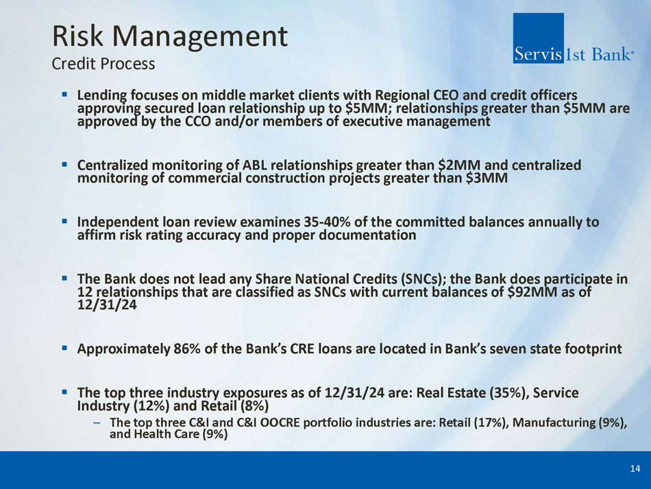 Risk Management ▪ Manage risk centrally while delivering products and services by each Regional Bank ▪ Centralized/Consistent: operations, compliance, risk, accounting, audit, information technology, and credit administration ▪ Investing resources in Risk Management Group – Invested in new technologies (ERM, BSA, information security, credit administration) – Enhanced staff and resources for risk, compliance, BSA, and credit administration – Increased scope of internal audits and independent loan reviews ▪ Management committees identify, monitor, and mitigate risks across enterprise ▪ Healthy Regulatory relations ▪ Independent loan portfolio stress testing performed regularly ▪ Correspondent Banking Division provides additional stable funding source 13