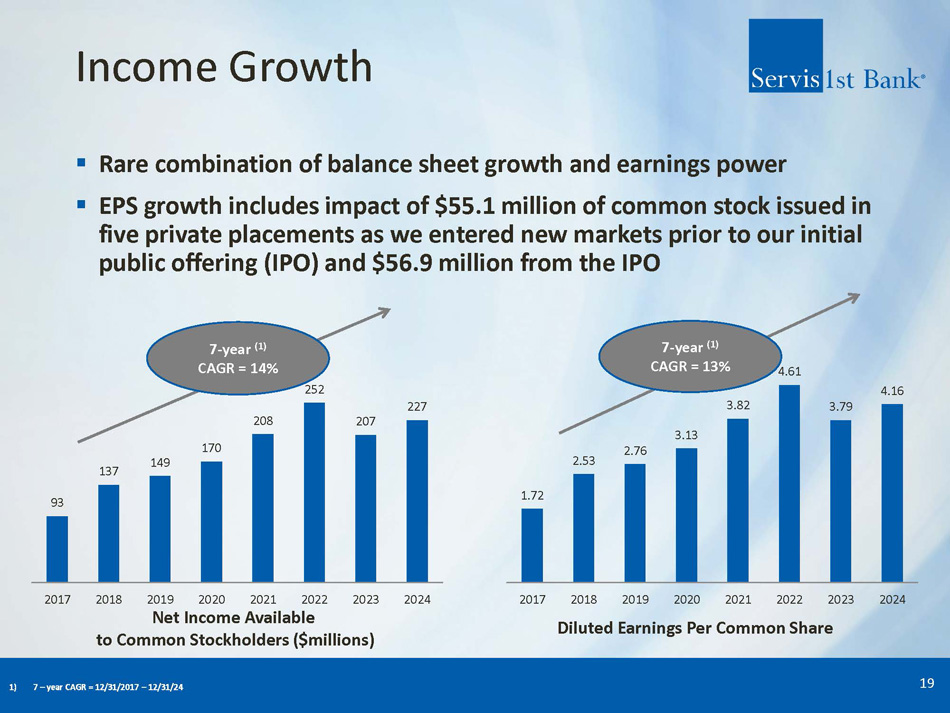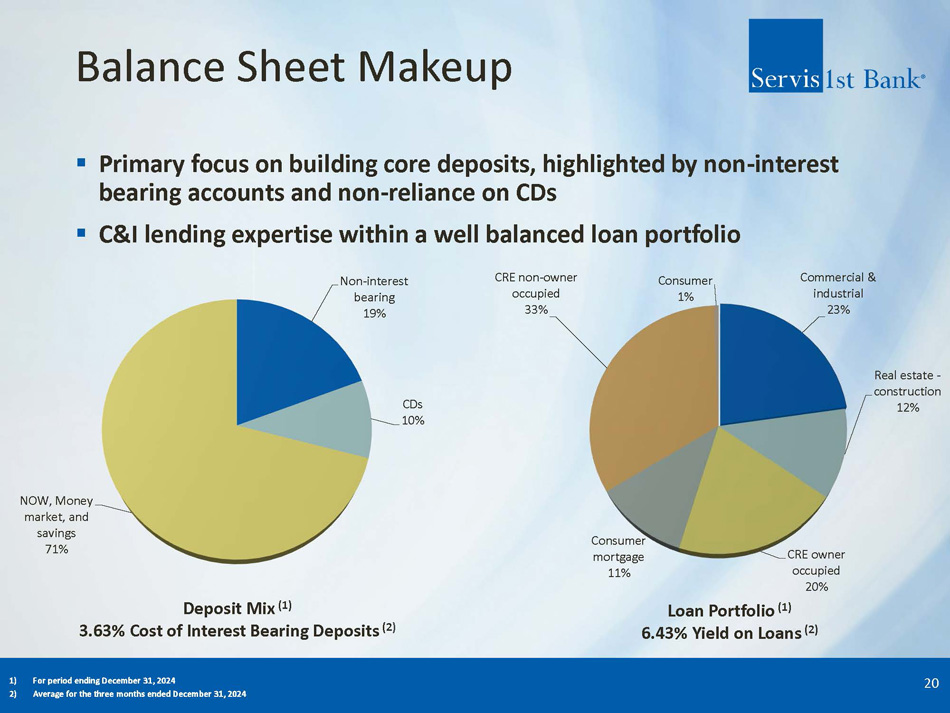 Income Growth ▪ Rare combination of balance sheet growth and earnings power ▪ EPS growth includes impact of $55.1 million of common stock issued in five private placements as we entered new markets prior to our initial public offering (IPO) and $56.9 million from the IPO 19 7 - year (1) CAGR = 14% 7 - year (1) CAGR = 13% Net Income Available to Common Stockholders ($millions) Diluted Earnings Per Common Share 1) 7 – year CAGR = 12/31/2017 – 12/31/24 93 137 149 170 208 252 207 227 2017 2018 2019 2020 2021 2022 2023 2024 1.72 2.53 2.76 3.13 3.82 4.61 3.79 4.16 2017 2018 2019 2020 2021 2022 2023 2024