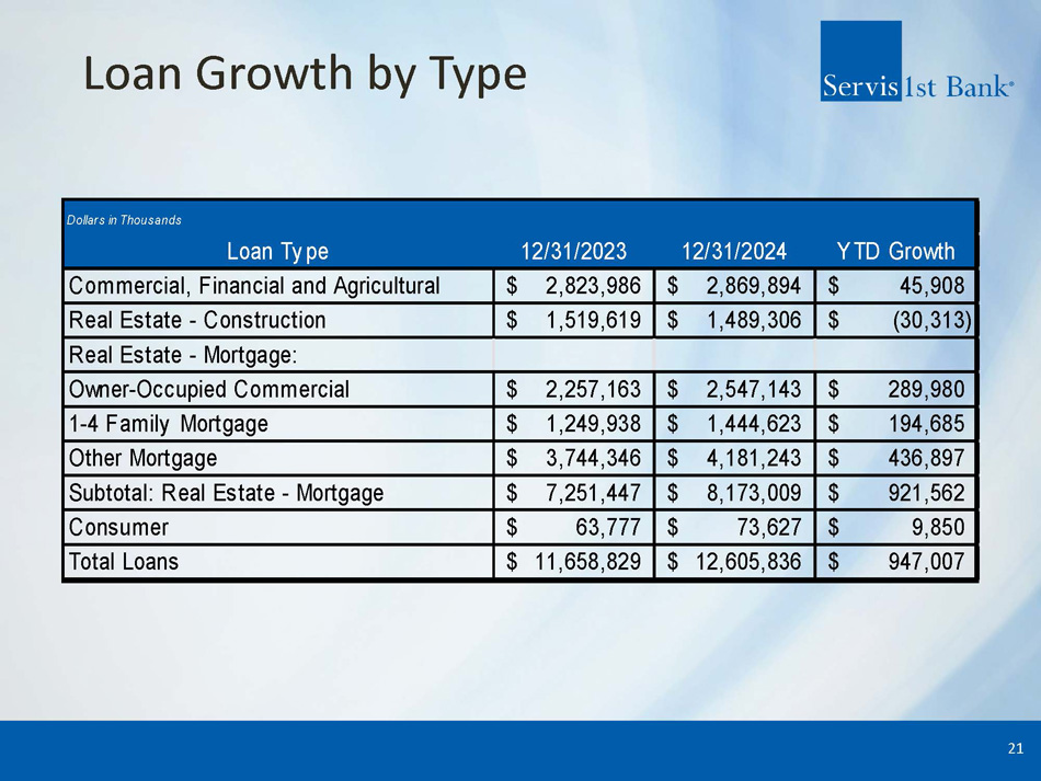 Balance Sheet Makeup ▪ Primary focus on building core deposits, highlighted by non - interest bearing accounts and non - reliance on CDs ▪ C&I lending expertise within a well balanced loan portfolio 20 Deposit Mix (1) 3.63% Cost of Interest Bearing Deposits (2 ) Loan Portfolio (1) 6.43% Yield on Loans (2) 1) For period ending December 31, 2024 2) Average for the three months ended December 31, 2024 Non - interest bearing 19% CDs 10% NOW, Money market, and savings 71% Commercial & industrial 23% Real estate - construction 12% CRE owner occupied 20% Consumer mortgage 11% CRE non - owner occupied 33% Consumer 1%
