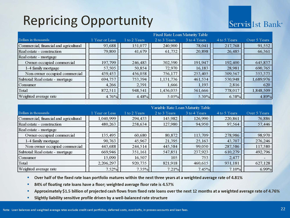 Loan Growth by Type 21 12/31/2023 12/31/2024 2,823,986$ 2,869,894$ 45,908$ 1,519,619$ 1,489,306$ (30,313)$ 2,257,163$ 2,547,143$ 289,980$ 1,249,938$ 1,444,623$ 194,685$ 3,744,346$ 4,181,243$ 436,897$ 7,251,447$ 8,173,009$ 921,562$ 63,777$ 73,627$ 9,850$ 11,658,829$ 12,605,836$ 947,007$ Total Loans Dollars in Thousands YTD GrowthLoan Type Commercial, Financial and Agricultural Real Estate - Construction Real Estate - Mortgage: Owner-Occupied Commercial 1-4 Family Mortgage Other Mortgage Subtotal: Real Estate - Mortgage Consumer