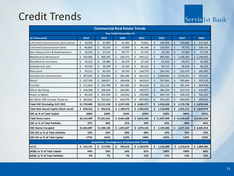 Credit Trends 23 (In Thousands) 2018 2019 2020 2021 2022 2023 2024 1-4 Family Construction Speculative $ 34,594 $ 47,809 $ 62,383 $ 74,811 $ 105,954 $ 109,800 $ 117,620 1-4 Family Construction Sold $ 46,467 $ 56,105 $ 55,899 $ 96,144 $ 116,556 $ 90,772 $ 108,714 Resi Acquisition & Development $ 24,542 $ 37,219 $ 50,777 $ 37,753 $ 35,530 $ 47,560 $ 57,278 Multifamily Permanent $ 160,981 $ 300,281 $ 316,372 $ 459,122 $ 869,483 $ 1,038,283 $ 1,248,669 Residential Lot Loans $ 26,222 $ 26,486 $ 36,179 $ 37,130 $ 51,816 $ 49,672 $ 41,600 Commercial Lots $ 43,610 $ 50,198 $ 51,195 $ 60,132 $ 50,717 $ 36,694 $ 46,225 Raw Land $ 50,111 $ 45,193 $ 54,793 $ 134,774 $ 164,932 $ 151,470 $ 162,435 Commercial Construction $ 307,645 $ 254,983 $ 282,389 $ 662,333 $ 1,006,883 $ 1,033,652 $ 955,433 Retail $ 207,309 $ 248,817 $ 304,858 $ 363,610 $ 537,466 $ 545,866 $ 597,129 Nursing Home or Assisted Living Facility $ 171,810 $ 252,780 $ 342,586 $ 363,410 $ 321,210 $ 301,244 $ 308,910 Office Building $ 204,368 $ 195,604 $ 260,982 $ 290,075 $ 384,209 $ 413,729 $ 434,407 Hotel or Motel $ 80,924 $ 101,054 $ 134,902 $ 259,986 $ 409,720 $ 458,329 $ 592,214 All Other CRE Income Property $ 380,822 $ 535,022 $ 643,979 $ 847,093 $ 978,145 $ 899,659 $ 999,913 Total CRE (Excluding O/O CRE) $1,739,405 $2,151,550 $ 2,597,292 $ 3,686,371 $ 5,032,620 $ 5,176,730 $ 5,670,548 Total Risk-Based Capital (Bank Level) $ 838,216 $ 962,616 $ 1,108,672 $ 1,303,623 $ 1,532,890 $ 1,691,212 $ 1,859,978 CRE as % of Total Capital 208% 224% 234% 283% 328% 306% 305% Total Gross Loans $6,533,499 $7,261,451 $ 8,465,688 $ 9,653,984 $ 11,687,968 $ 11,658,829 $12,605,836 CRE as % of Total Portfolio 27% 30% 31% 39% 43% 44% 45% CRE Owner Occupied $1,463,887 $1,588,148 $ 1,693,427 $ 1,874,103 $ 2,199,280 $ 2,257,163 $ 2,445,914 CRE OO as % of Total Portfolio 22% 22% 20% 20% 19% 19% 19% CRE OO as % of Total Capital 175% 165% 153% 144% 143% 133% 132% AD&C $ 533,191 $ 517,992 $ 593,614 $ 1,103,076 $ 1,532,388 $ 1,519,619 $ 1,489,305 AD&C as % of Total Capital 64% 54% 54% 85% 100% 100% 80% AD&C as % of Total Portfolio 8% 7% 7% 12% 13% 13% 12% Commercial Real Estate Trends Acquisition, Development, & Construction Trends Year Ended December 31