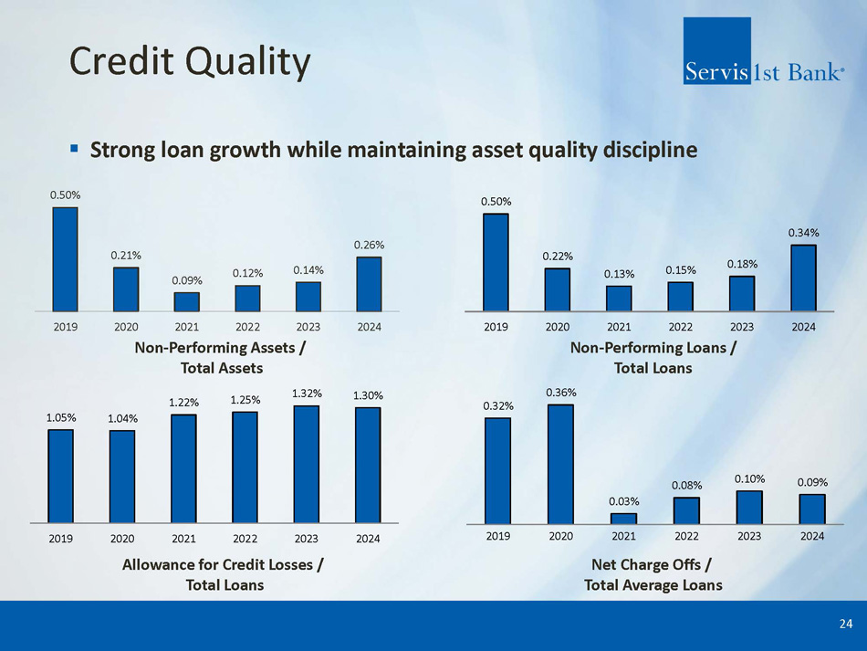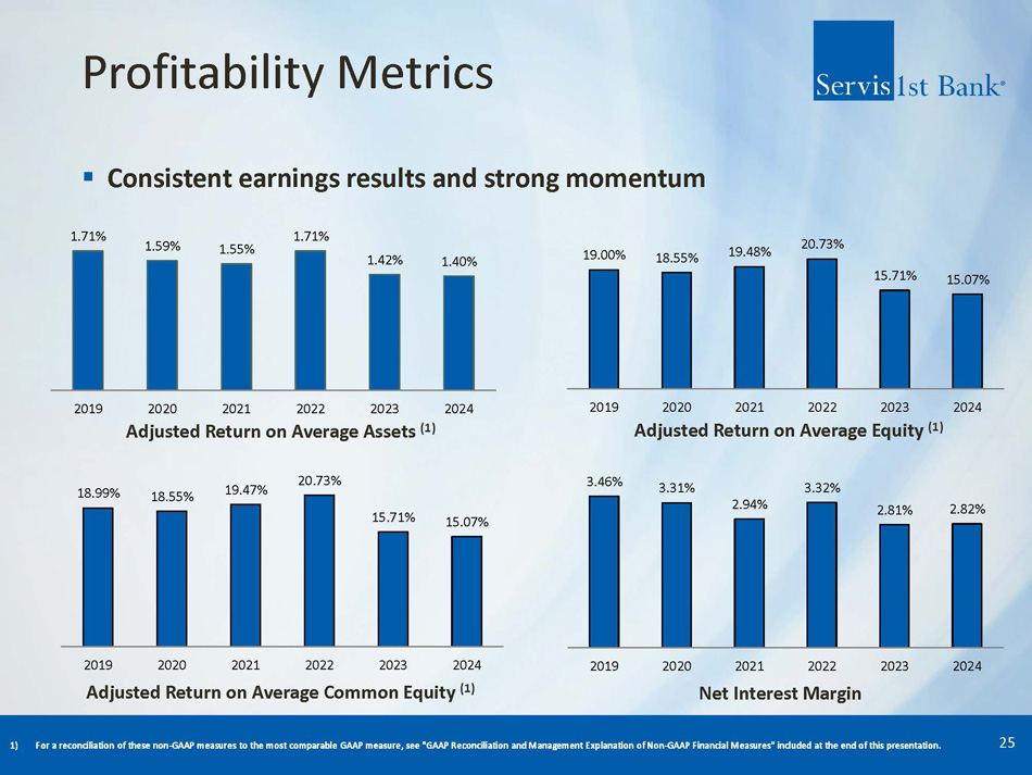 Credit Quality ▪ Strong loan growth while maintaining asset quality discipline 24 Allowance for Credit Losses / Total Loans Net Charge Offs / Total Average Loans Non - Performing Assets / Total Assets Non - Performing Loans / Total Loans 0.50% 0.21% 0.09% 0.12% 0.14% 0.26% 2019 2020 2021 2022 2023 2024 0.50% 0.22% 0.13% 0.15% 0.18% 0.34% 2019 2020 2021 2022 2023 2024 0.32% 0.36% 0.03% 0.08% 0.10% 0.09% 2019 2020 2021 2022 2023 2024 1.05% 1.04% 1.22% 1.25% 1.32% 1.30% 2019 2020 2021 2022 2023 2024