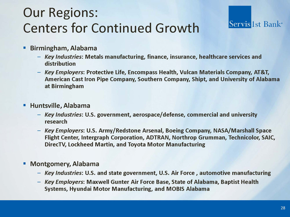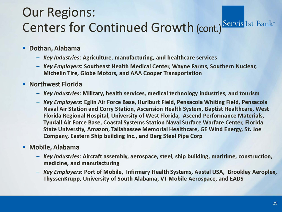 Our Regions: Centers for Continued Growth ▪ Birmingham , Alabama – Key Industries : Metals manufacturing, finance, insurance, healthcare services and distribution – Key Employers : Protective Life, Encompass Health, Vulcan Materials Company, AT & T, American Cast Iron Pipe Company, Southern Company, Shipt, and University of Alabama at Birmingham ▪ Huntsville , Alabama – Key Industries : U . S . government, aerospace / defense , commercial and university research – Key Employers : U . S . Army/Redstone Arsenal, Boeing Company, NASA/Marshall Space Flight Center, Intergraph Corporation, ADTRAN, Northrop Grumman, Technicolor, SAIC, DirecTV, Lockheed Martin, and Toyota Motor Manufacturing ▪ Montgomery , Alabama – Key Industries : U . S. and state government, U . S. Air Force , automotive manufacturing – Key Employers : Maxwell Gunter Air Force Base, State of Alabama, Baptist Health Systems, Hyundai Motor Manufacturing, and MOBIS Alabama 28