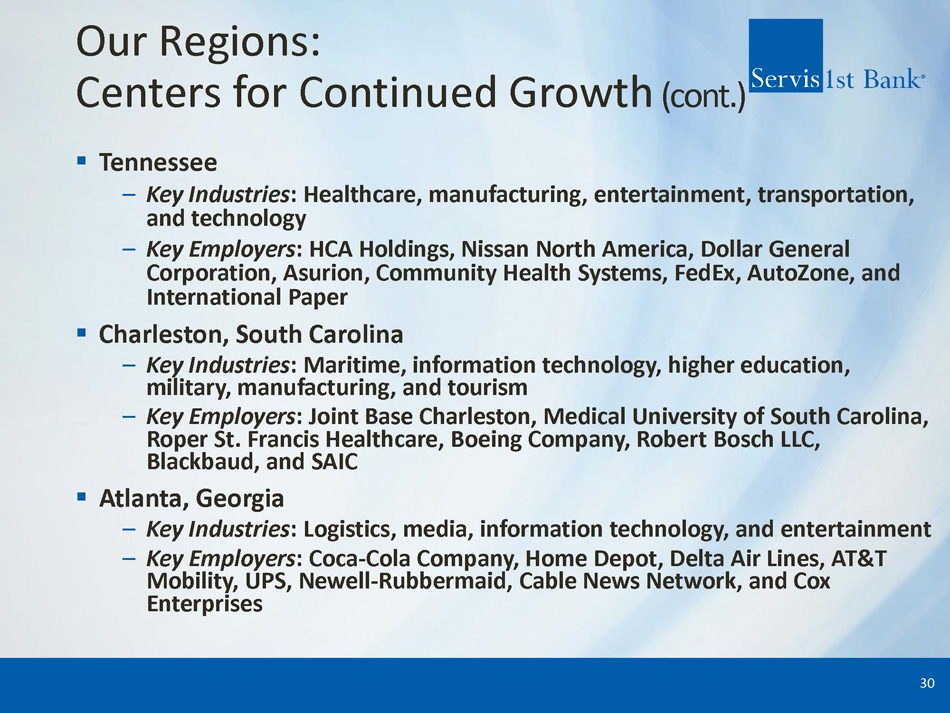 Our Regions: Centers for Continued Growth (cont.) ▪ Dothan, Alabama – Key Industries : Agriculture, manufacturing, and healthcare services – Key Employers : Southeast Health Medical Center, Wayne Farms, Southern Nuclear, Michelin Tire, Globe Motors, and AAA Cooper Transportation ▪ Northwest Florida – Key Industries : Military, health services, medical technology industries, and tourism – Key Employers : Eglin Air Force Base, Hurlburt Field, Pensacola Whiting Field, Pensacola Naval Air Station and Corry Station, Ascension Health System, Baptist Healthcare, West Florida Regional Hospital, University of West Florida, Ascend Performance Materials, Tyndall Air Force Base, Coastal Systems Station Naval Surface Warfare Center, Florida State University, Amazon, Tallahassee Memorial Healthcare, GE Wind Energy, St. Joe Company, Eastern Ship building Inc., and Berg Steel Pipe Corp ▪ Mobile, Alabama – Key Industries : Aircraft assembly, aerospace, steel, ship building, maritime, construction, medicine, and manufacturing – Key Employers : Port of Mobile, Infirmary Health Systems, Austal USA, Brookley Aeroplex , ThyssenKrupp, University of South Alabama, VT Mobile Aerospace, and EADS 29
