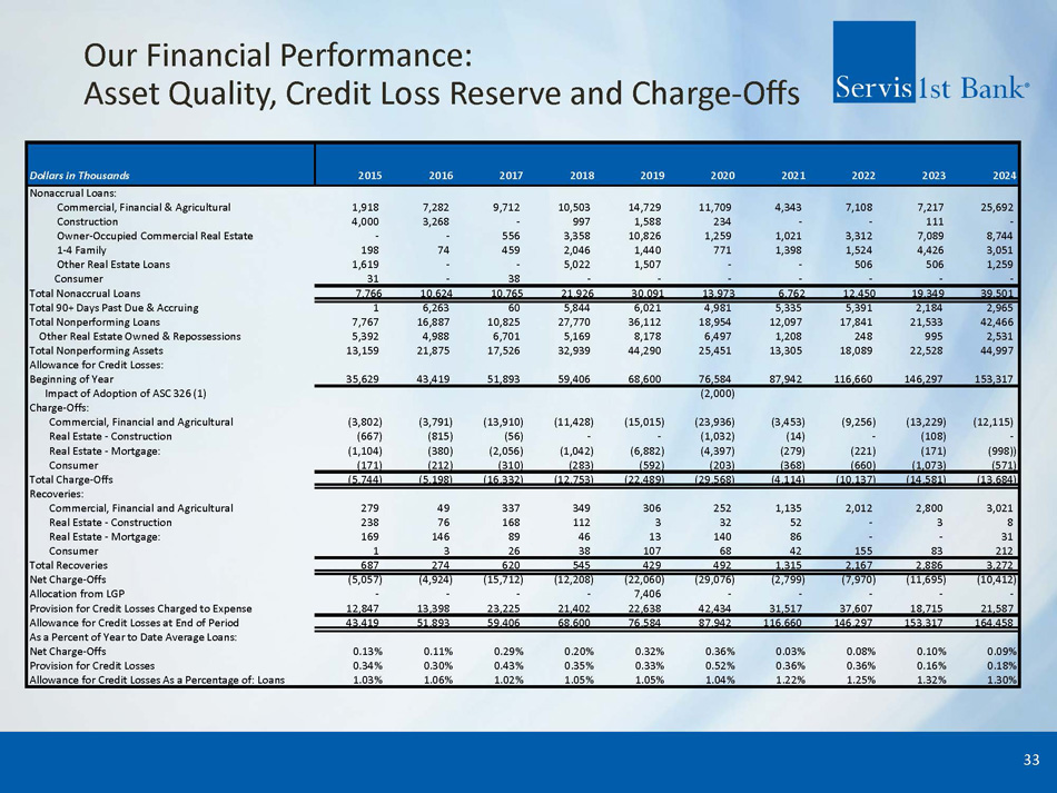 Our Financial Performance: Key Operating and Performance Metrics 32 1) For a reconciliation of these non - GAAP measures to the most comparable GAAP measure, see "GAAP Reconciliation and Management Exp lanation of Non - GAAP Financial Measures" included at the end of this presentation. 2) Non - GAAP financial measures. "Tangible Common Equity to Tangible Assets" and "Tangible Book value per Share" are not measures o f financial performance recognized by generally accepted accounting principles in the United States, or GAAP. Dollars in Millions Except per Share Amounts 2024 2023 2022 2021 2020 2019 2018 2017 2016 2015 Balance Sheet $17,352 $16,130 $14,596 $15,449 $11,933 8948 $8,007 $7,082 $6,370 $5,096 Total Assets $12,441 $11,506 $11,542 $9,416 $8,378 7185 $6,465 $5,792 $4,860 $4,173 Net Loans $13,543 $13,274 $11,547 $12,453 $9,976 7530 $6,916 $6,092 $5,420 $4,224 Deposits 92% 87% 100% 76% 84% 95% 93% 95% 90% 99% Net Loans / Deposits $1,617 $1,440 $1,298 $1,152 $993 $843 $715 $608 $523 $449 Total Equity Profitability $227.2 $206.9 $251.5 $207.7 $169.6 $149.2 $136.9 $93.1 $81.5 $63.5 Net Income $227.2 $206.8 $251.4 $207.7 $169.5 $149.2 $136.9 $93.0 $81.4 $63.3 Net Income Available to Common $22 8 . 5 $206.8 $251.4 $210.0 $169.5 $147.9 $136.9 $96.3 $81.4 $65.0 Adj. Net Income Available to Common (1) 1. 40 % 1.37% 1.71% 1.55% 1.59% 1.71% 1.88% 1.48% 1.42% 1.42% Adj. ROAA (1) 1 5.07 % 15.13% 20.73% 19.48% 18.55% 19.00% 20.96% 16.96% 16.64% 14.96% Adj. ROAE (1) 1 5.07 % 15.13% 20.73% 19.47% 18.55% 18.99% 20.95% 16.95% 16.63% 15.73% Adj. ROACE (1) 2.82% 2.81% 3.32% 2.94% 3.31% 3.46% 3.75% 3.68% 3.42% 3.75% Net Interest Margin 37. 34 % 40.67% 31.30% 31.84% 30.29% 33.31% 32.57% 34.71% 39.47% 40.73% Adj. Efficiency Ratio (1) Capital Adequacy 9.25% 8.85% 8.81% 7.38% 8.22% 9.27% 8.77% 8.39% 7.99% 8.54% Tangible Common Equity to Tangible Assets (2) 11. 42 % 10 . 9 1 % 9.55% 9.95% 10.50% 10.50% 10.12% 9.51% 9.78% 9.72% Common Equity Tier 1 RBC Ratio 9.5 9 % 9.12% 9.29% 7.39% 8.23% 9.13% 9.07% 8.51% 8.22% 8.55% Tier I Leverage Ratio 11. 42 % 10.92% 9.55% 9.96% 10.50% 10.50% 10.13% 9.52% 9.78% 9.73% Tier I RBC Ratio 12. 90 % 12.45% 11.03% 11.58% 12.20% 12.31% 12.05% 11.52% 11.84% 11.95% Total RBC Ratio Asset Quality 0. 2 6% 0.1 4 % 0.12% 0.09% 0.21% 0.50% 0.41% 0.25% 0.34% 0.26% NPAs / Assets 0.0 9 % 0. 10 % 0.08% 0.03% 0.36% 0.32% 0.20% 0. 29 % 0.11% 0.13% NCOs / Average Loans 1.30% 1.32% 1.25% 1.22% 1.04% 1.05% 1.05% 1.02% 1.06% 1.03% Credit Loss Reserve / Gross Loans Per Share Information 54,5 70 , 138 54,461,580 54,326,527 54,227,060 53,943,751 53,623,740 53,375,195 52,992,586 52,636,896 51,945,396 Common Shares Outstanding $29.63 $26.45 $23.89 $21.24 $18.41 $15.71 $13.40 $11.47 $9.93 $8.65 Book Value per Share $29.38 $26.20 $23.64 $20.99 $18.15 $15.45 $13.13 $11.19 $9.65 $8.35 Tangible Book Value per Share (2) $4.16 $3.79 $4.61 $3.82 $3.13 $2.76 $2.53 $1.72 $1.52 $1.20 Diluted Earnings per Share $4.1 8 $3.79 $4.61 $3.86 $3.13 $2.74 $2.53 $1.78 $1.52 $1.23 Adj. Diluted Earnings per Share (1)