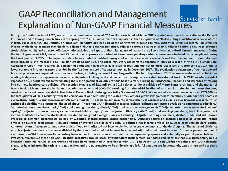GAAP Reconciliation and Management Explanation of Non - GAAP Financial Measures During the fourth quarter of 2023 , we recorded a one - time expense of $ 7 . 2 million associated with the FDIC’s special assessment to recapitalize the Deposit Insurance Fund following bank failures in the spring of 2023 . This assessment was updated in the first quarter of 2024 resulting in additional expense of $ 1 . 8 million . These expenses are unusual, or infrequent, in nature and not part of the noninterest expense run rate . Each of adjusted net income, adjusted net income available to common stockholders, adjusted diluted earnings per share, adjusted return on average assets, adjusted return on average common stockholders’ equity and adjusted efficiency ratio excludes the impact of these items, net of tax, and are all considered non - GAAP financial measures . During the fourth quarter of 2021 , we recorded $ 3 . 0 million of expenses associated with our core operating system conversion scheduled to be completed during the third quarter of 2022 . The expenses relate to negotiated liquidated damages of our existing system contracts and the procurement of our data from those providers . We recorded a $ 1 . 7 million credit to our FDIC and other regulatory assessments expense in 2019 as a result of the FDIC’s Small Bank Assessment Credit . We recorded $ 3 . 1 million of additional tax expense as a result of revaluing our net deferred tax assets at December 31 , 2017 due to lower corporate income tax rates provided by the Tax Cuts and Jobs Act passed into law in December 2017 . The revaluation adjustment of our net deferred tax asset position was impacted by a number of factors, including increased loan charge - offs in the fourth quarter of 2017 , increases in deferred tax liabilities relating to depreciation expense on our new headquarters building, and dividends from our captive real estate investment trusts . In 2017 we also recorded expenses of $ 347 , 000 related to terminating the lease agreement on our previous headquarters building in Birmingham, Alabama and expenses of moving into our new headquarters building . We recorded expenses of $ 2 . 1 million in 2015 related to the acquisition of Metro Bancshares, Inc . and the merger of Metro Bank with and into the bank, and recorded an expense of $ 500 , 000 resulting from the initial funding of reserves for unfunded loan commitments, consistent with guidance provided in the Federal Reserve Bank’s Interagency Policy Statement SR 06 - 17 . We recorded a non - routine expense of $ 703 , 000 for the first quarter of 2014 resulting from the correction of our accounting for vested stock options previously granted to members of our advisory boards in our Dothan, Huntsville and Montgomery, Alabama markets . The table below presents computations of earnings and certain other financial measures which exclude the significant adjustments discussed above . These non - GAAP financial measures include “adjusted net income available to common stockholders,” “adjusted earnings per share, basic,” “adjusted earnings per share, diluted,” “adjusted return on average assets,” “adjusted return on average stockholders’ equity,” “adjusted return on average common stockholders’ equity” and “adjusted efficiency ratio . ” Adjusted earnings per share, basic is adjusted net income available to common stockholders divided by weighted average shares outstanding . Adjusted earnings per share, diluted is adjusted net income available to common stockholders divided by weighted average diluted shares outstanding . Adjusted return on average assets is adjusted net income divided by average total assets . Adjusted return of average stockholders’ equity is adjusted net income divided by average total stockholders’ equity . Adjusted return of average common stockholders’ equity is adjusted net income divided by average common stockholders’ equity . The adjusted efficiency ratio is adjusted non - interest expense divided by the sum of adjusted net interest income and adjusted non - interest income . Our management and board use these non - GAAP measures for reporting financial performance to internal users for management purposes and externally as part of presentations to investors . We believe these non - GAAP financial measures provide useful information to management, our board and investors that is supplementary to our financial condition, results of operations and cash flows computed in accordance with GAAP ; however, we acknowledge that these non - GAAP financial measures have inherent limitations, are not audited and are not required to be uniformly applied . All amounts are in thousands, except share and per share data . 34