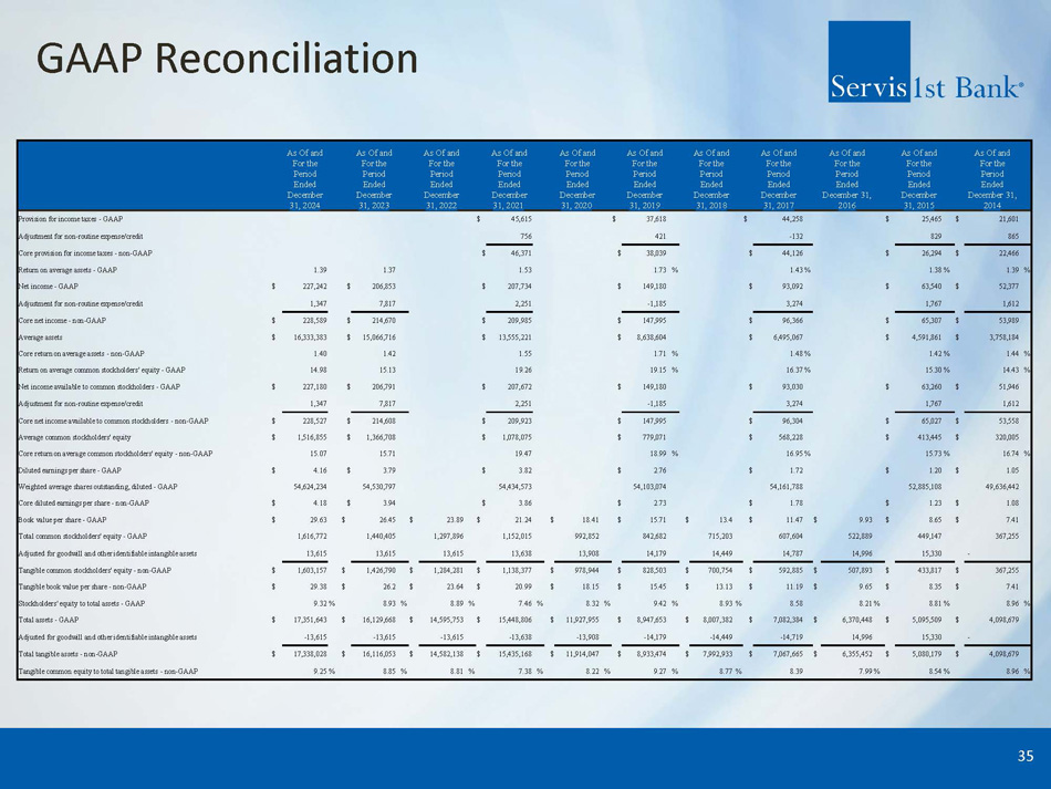 GAAP Reconciliation 35 As Of and For the Period Ended December 31, 2014 As Of and For the Period Ended December 31, 2015 As Of and For the Period Ended December 31, 2016 As Of and For the Period Ended December 31, 2017 As Of and For the Period Ended December 31, 2018 As Of and For the Period Ended December 31, 2019 As Of and For the Period Ended December 31, 2020 As Of and For the Period Ended December 31, 2021 As Of and For the Period Ended December 31, 2022 As Of and For the Period Ended December 31, 2023 As Of and For the Period Ended December 31, 2024 21,601 $ 25,465 $ 44,258 $ 37,618 $ 45,615 $ Provision for income taxes - GAAP 865 829 - 132 421 756 Adjustment for non - routine expense/credit 22,466 $ 26,294 $ 44,126 $ 38,039 $ 46,371 $ Core provision for income taxes - non - GAAP % 1.39 % 1.38 % 1.43 % 1.73 1.53 1.37 1.39 Return on average assets - GAAP 52,377 $ 63,540 $ 93,092 $ 149,180 $ 207,734 $ 206,853 $ 227,242 $ Net income - GAAP 1,612 1,767 3,274 - 1,185 2,251 7,817 1,347 Adjustment for non - routine expense/credit 53,989 $ 65,307 $ 96,366 $ 147,995 $ 209,985 $ 214,670 $ 228,589 $ Core net income - non - GAAP 3,758,184 $ 4,591,861 $ 6,495,067 $ 8,638,604 $ 13,555,221 $ 15,066,716 $ 16,333,383 $ Average assets % 1.44 % 1.42 % 1.48 % 1.71 1.55 1.42 1.40 Core return