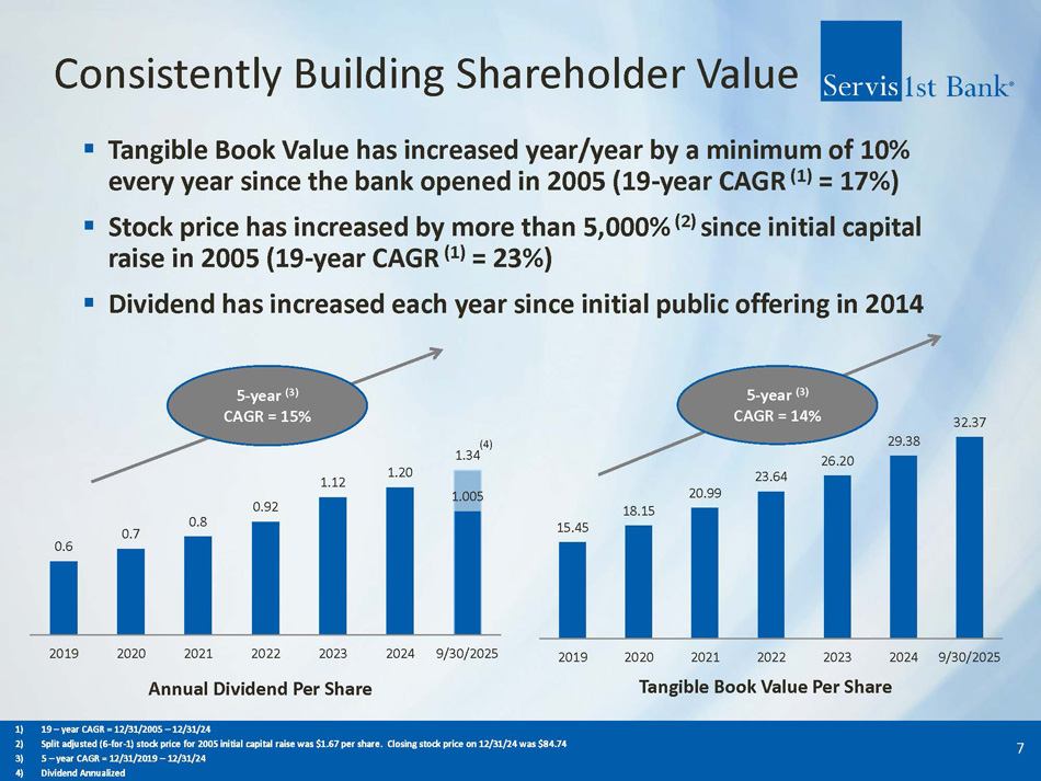 Milestones 6 ▪ Founded in May 2005 with initial capital raise of $35 million ▪ Reached profitability during the fourth quarter of 2005 and have been profitable every quarter since ▪ Achieved total asset milestones of: – $1 billion in 2008 $5 billion in 2015 $9 billion in 2019 $17 billion in 2024 $2 billion in 2011 $6 billion in 2016 $11 billion in 2020 $18 billion in 2025 $3 billion in 2013 $7 billion in 2017 $15 billion in 2021 $4 billion in 2014 $8 billion in 2018 $16 billion in 2023 ’13: April - Nashville, TN April - Mobile, AL January ‘15: Metro Bank Acquisition August ’06: Huntsville, AL September ’08: Dothan, AL January ‘17: Fairhope, AL August '19: SW Florida April ’21: Orlando, FL February ’24: Memphis, TN May ’05: Founded in Birmingham, AL June ’07: Montgomery, AL ’11: March - Correspondent Banking April - Pensacola, FL May ’14: Initial Public Offering January ’15: Charleston, SC January ’16: Tampa Bay, FL September ‘18: Fort Walton, FL August ‘20: Columbus, GA ’22: March - Panama City, FL May - Piedmont, NC May - Tallahassee, FL September - Asheville, NC April ’23: Virginia Beach, VA July '24: Auburn, AL 2005 2007 2009 2011 2013 2015 2017 2019 2021 2023 2025