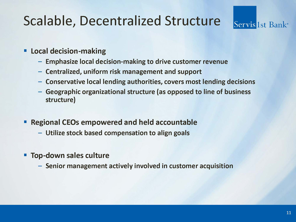 Our Business Model ▪ “Loan making and deposit taking” – Traditional commercial banking services – No emphasis on non - traditional business lines ▪ Culture of cost control – “Branch light,” with $427 million average deposits per banking center – Leverage technology and centralized infrastructure – Headcount focused on production and risk management – Key products; including remote deposit capture (approximately 2/3 of checks deposited are via remote deposit capture and mobile deposit), cash management, remote currency manager – Outsource selected functions ▪ C&I and Owner Occupied CRE lending expertise – 42% of gross loans – Target customers: privately held businesses $2 to $250 million in annual sales, professionals, affluent consumers 10